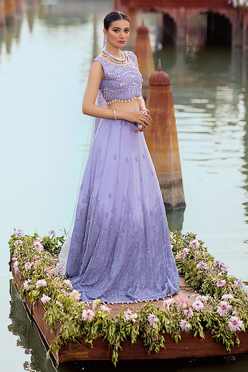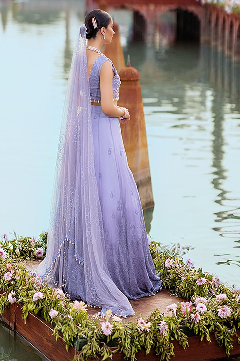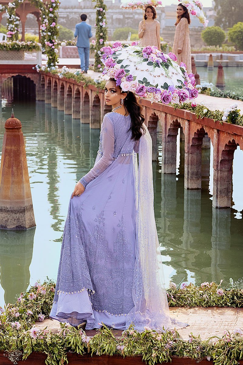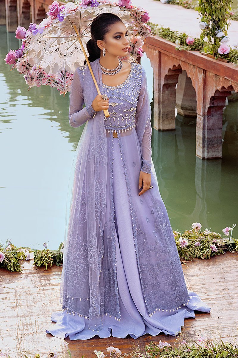 Fabric: Embroidered and sequinned chiffon for front and back Embroidered and hand embellished front yoke on chiffon Embroidered and sequinned chiffon for back yoke Embroidered and sequinned sleeves on chiffon Embroidered and sequinned finishing patti Embroidered and sequinned border for shirt on organza Embroidered and sequinned border for sleeves Sequinned net dupata Raw silk trousers Cotton silk undershirt Pearls for finishing Diamante balls for finishing |