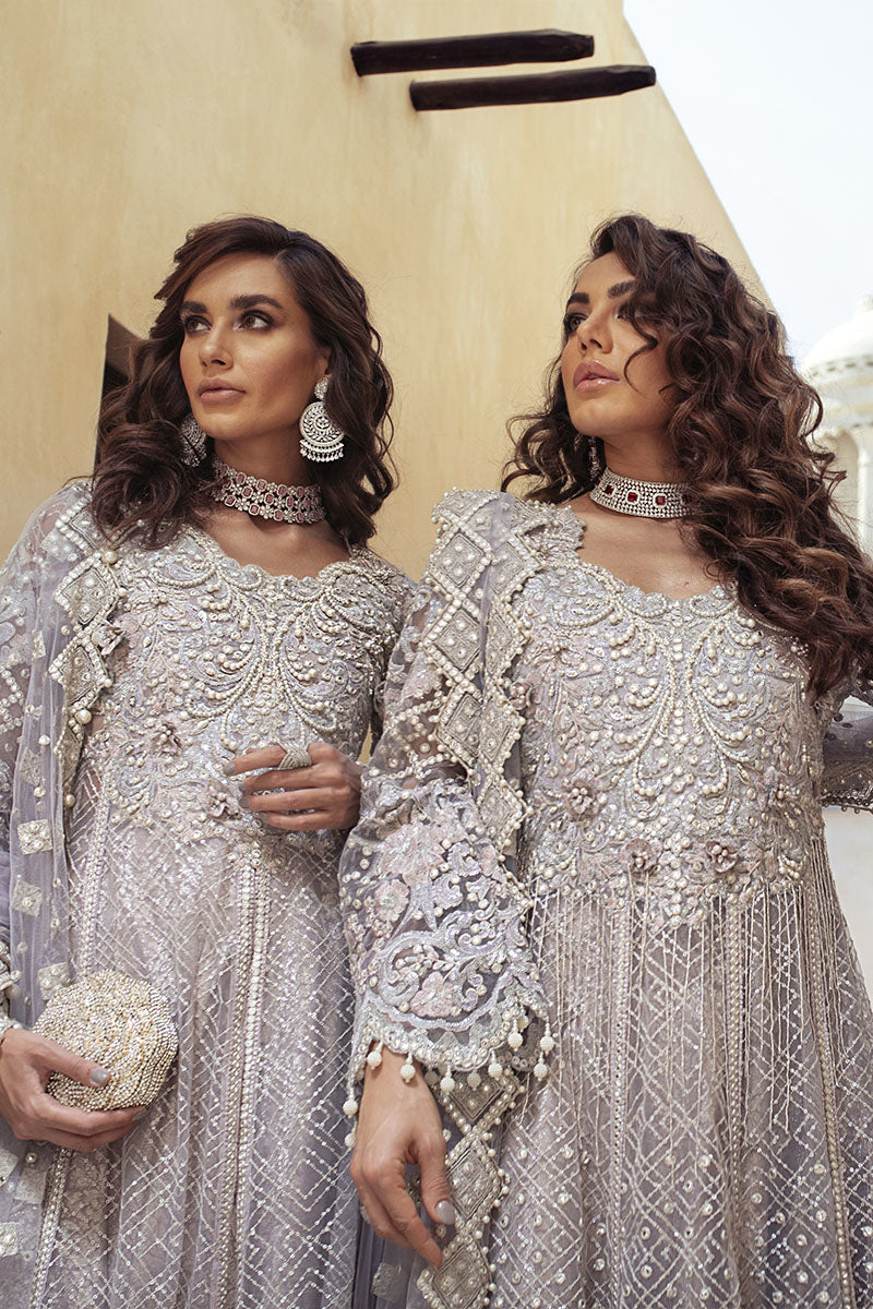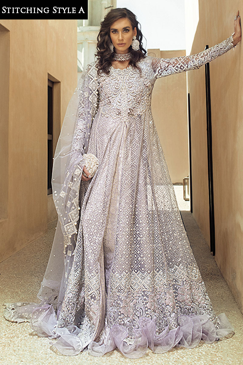 Fabric:Embroidered, sequinned and pani embellished front and back on net Embroidered, sequinned and pani embellished sleeves on net Embroidered and hand embellished neckline Embroidered, sequinned and pani embellished border for front and back Embroidered, pani and pearl embellished net dupatta Finishing lace for panels Embroidered 3D flowers for back Dyed Jamawar Lehnga Cotton silk undershirt Pearls for finishing Drops for finishing |