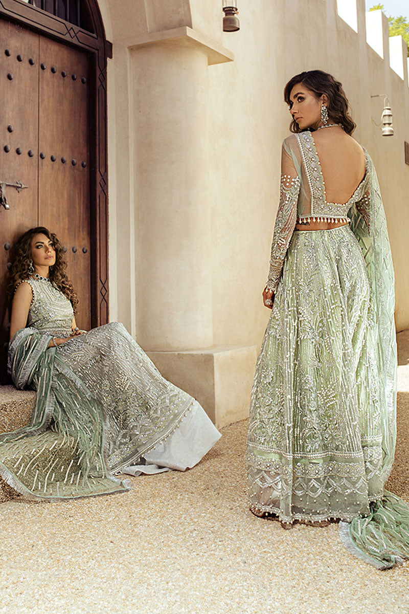 Fabric:Embroidered, sequinned and pani embellished net for front and back Embroidered, sequinned and pani embellished yoke on organza with handwork Dyed organza for back yoke Embroidered, sequinned and pani embellished neckline for back Embroidered, sequinned and pani embellished sleeves on net Pani embroidered and sequinned border front and back daman Sequinned and pani embroidered finishing lace with pearls Jamawar Lehnga Cotton silk undershirt Pani embroidered net dupatta Kiran lace for dupatta Drops for shirt finishing |