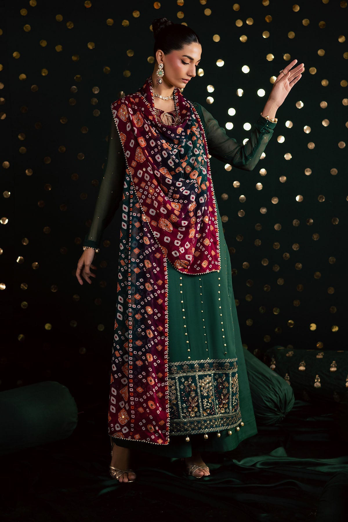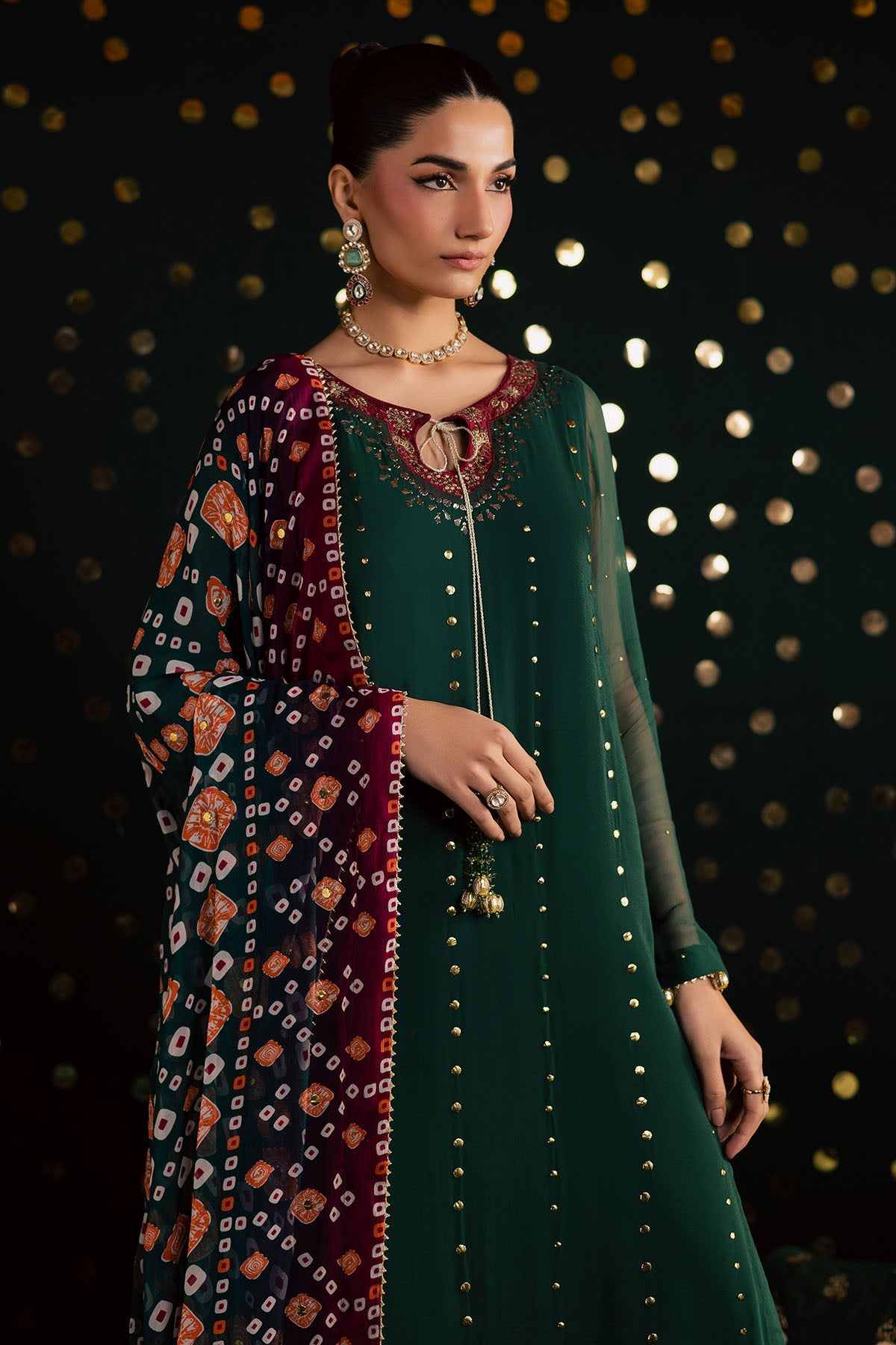 Summary: Embrace timeless elegance with the Nureh Mukeshkari Chiffon Formal suit. This stunning Pakistani dress features a deep green kameez crafted from luxurious chiffon, adorned with delicate Mukeshkari work that adds a subtle shimmer. The lightweight and breathable chiffon fabric makes it an ideal choice for Spring/Summer festivities. An exquisitely embroidered silk neck patch and an ornate organza daman border enhance its formal appeal. The rich green hue makes this ethnic wear a perfect outfit for Mehndi functions, Eid celebrations, or as a sophisticated wedding guest dress. This unstitched suit is the epitome of grace for any formal occasion.