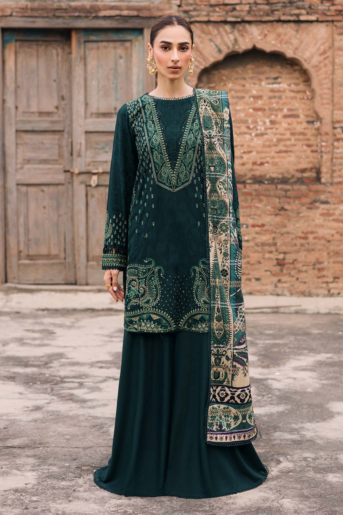 Summary: Embrace the elegance of the season with this stunning deep green Pakistani suit from Nureh's Fall/Winter collection. The kameez is crafted from luxurious embroidered self-linen jacquard, a fabric renowned for its warmth and rich texture, making it perfect for cooler weather. It features exquisite, intricate embroidery in contrasting tones that adorn the neckline and flow down the front, creating a look of sophisticated grace. This unstitched ethnic wear ensemble exudes a formal charm, making it an ideal choice for winter festivities, formal dinners, or as a distinguished wedding guest outfit.