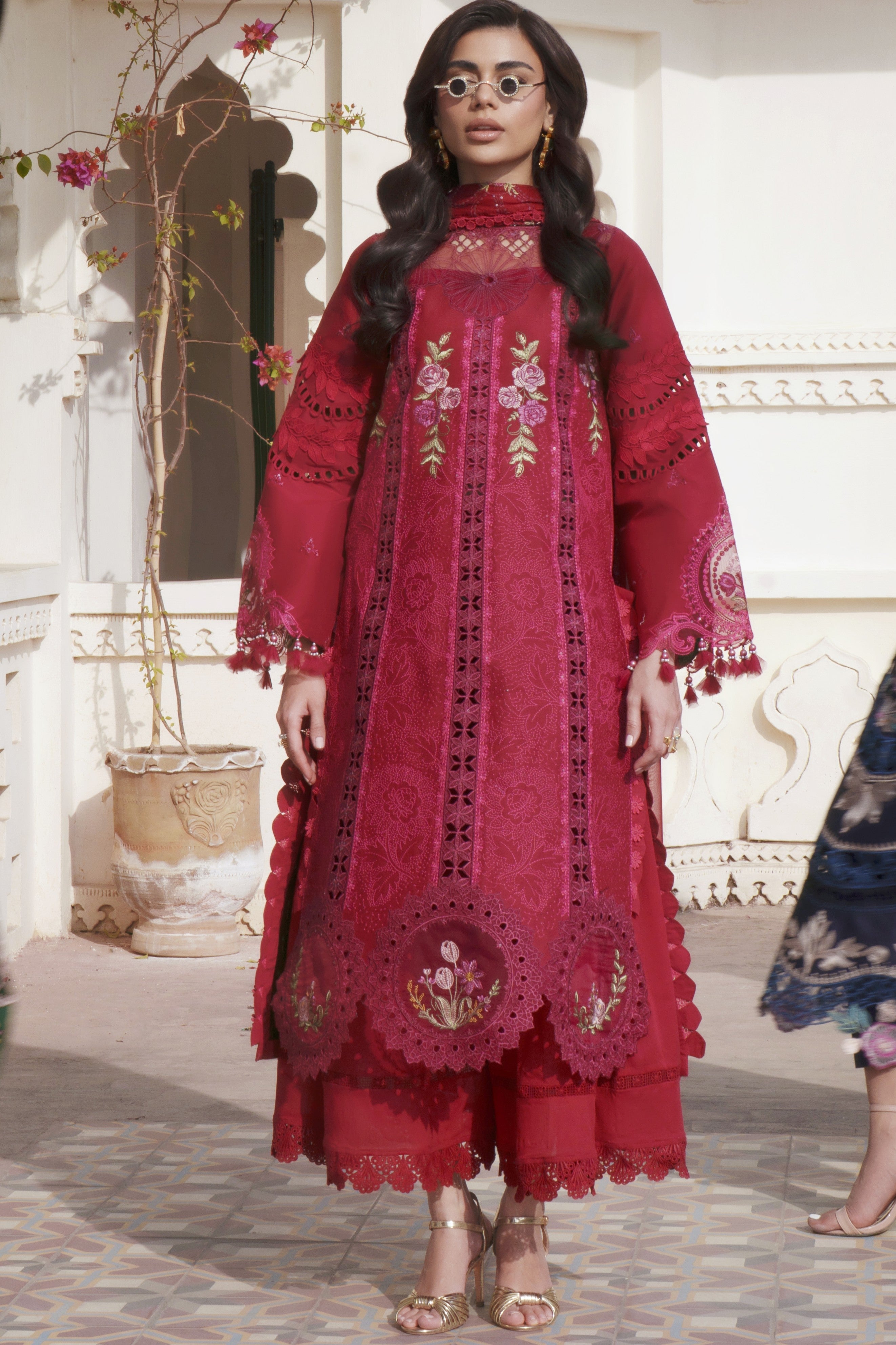 Summary: Embrace summer elegance with the Parishay Shangrila Summer Lawn suit. This stunning Pakistani dress features a vibrant red kameez crafted from high-quality, breathable lawn fabric, making it perfect for warmer seasons. The shirt is a masterpiece of design, adorned with exquisite embroidery on the front panel, a dedicated neckline piece, the daman (hem), and sleeve borders. This unstitched ethnic wear allows for custom tailoring, ensuring a perfect fit. The rich red hue and detailed craftsmanship make this summer outfit an excellent choice for festive wear, such as Eid celebrations, weddings, or any formal gathering where you want to make a statement.