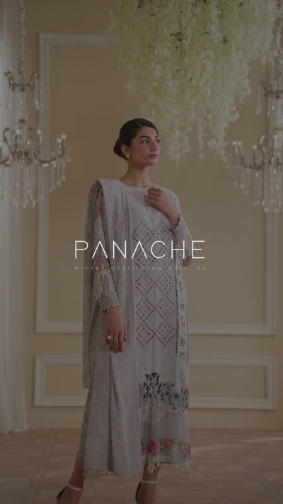Summary: The Parishay Panache Fall/Winter Collection presents PN-05, a stunning off-white karandi Pakistani suit perfect for making a statement at any party. This unstitched three-piece ensemble features an intricately embroidered karandi front, paired with dyed karandi plain back and sleeves. The delicate embroidered neckline, front daman, and embroidered patches for the sleeves add a touch of traditional elegance. The included embroidered borders for both the front and sleeves allow for customization and added flair. The outfit is completed with a luxurious palachi shawl, offering warmth and style, along with dyed karandi plain trousers. This beautiful suit offers the perfect canvas for you to create a personalized look that’s both sophisticated and on-trend. Embrace the rich texture of karandi and celebrate the festive season with Parishay Panache.
