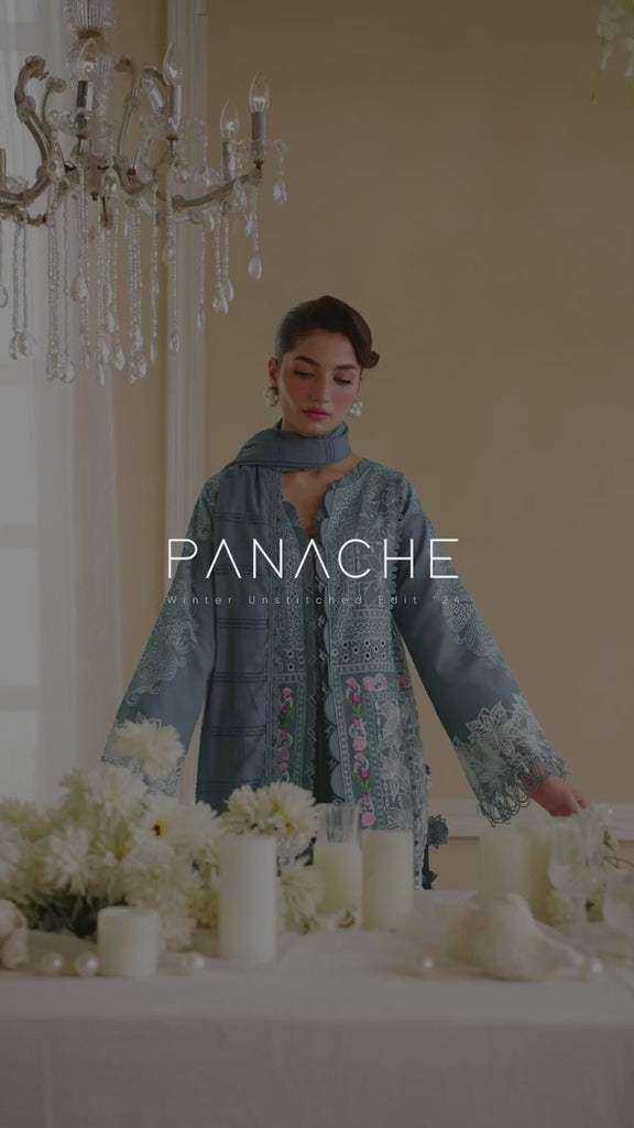 Summary: The Parishay Panache Fall/Winter PN-08 presents an exquisite blue khaddar Pakistani suit designed for festive occasions. This unstitched three-piece ensemble includes an intricately embroidered khaddar shirt, a luxurious velvet jacquard shawl, and plain dyed khaddar trousers. The shirt boasts a captivating embroidered front, offering a blend of traditional and contemporary aesthetics. Crafted from high-quality khaddar fabric, this suit promises both comfort and style for the cooler seasons. The rich velvet jacquard shawl drapes beautifully, adding a touch of opulence to the overall look. The plain trousers complement the shirt's embellishments, creating a balanced and harmonious silhouette. This elegant ensemble is perfect for party wear and can be tailored to your individual preferences. The Parishay Panache PN-08 guarantees authenticity and a 100% original product. This stunning Pakistani suit is an ideal choice for those seeking a sophisticated and festive look.