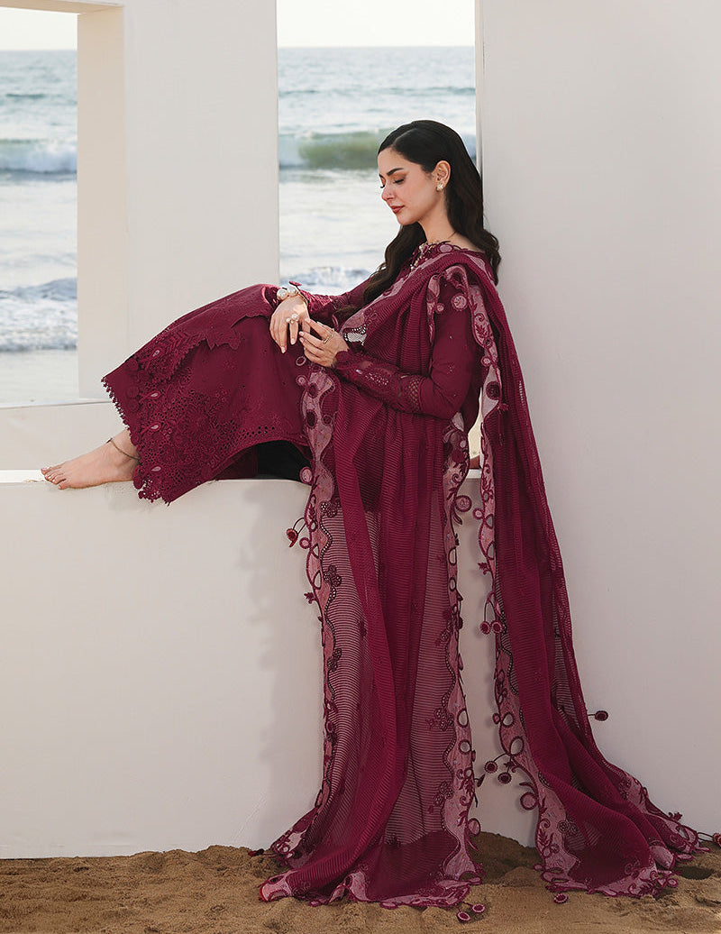 Summary: Embrace timeless elegance with this Qalamkar Sahil Luxury Lawn suit (SA-14 NELAM), beautifully adorned by Hania Aamir. This stunning Pakistani dress features an exquisite maroon kameez crafted from breathable lawn, making it a perfect summer outfit. The shirt is a masterpiece of craftsmanship, with intricate Chikankari embroidery on the front panels, back, and sleeves, further enhanced with delicate 3D flowers. The rich maroon hue makes this ethnic wear a sophisticated choice for formal gatherings, Eid celebrations, or as a distinguished wedding guest outfit. An ideal festive clothing choice.