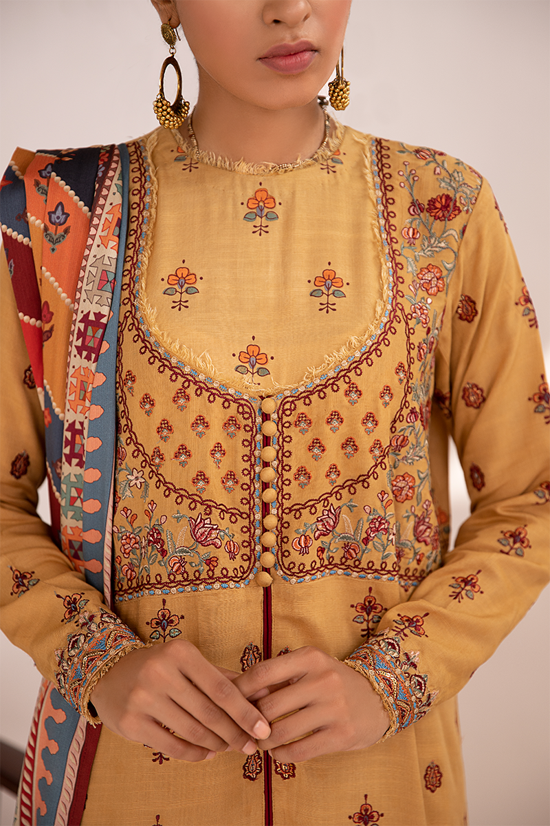 Fabric:Embroidered Front Embroidered Front Bodice Block Printed Back Embroidered Sleeves Embroidered Lace for Front, Back, and Sleeves Digital Printed Shawl Plain Trouser Please Note: Printed Bodice Can Be Made Out OF Back’s Fabric |