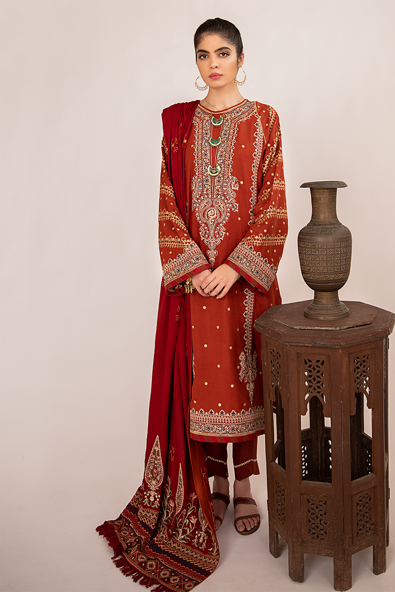 Fabric:Block Printed Front Block Printed Back Block Printed Sleeves Embroidered Neckline Embroidered Front Lace Embroidered Front Motifs Embroidered Border For Front, Back, and Sleeves Embroidered Shawl Plain Trouser |