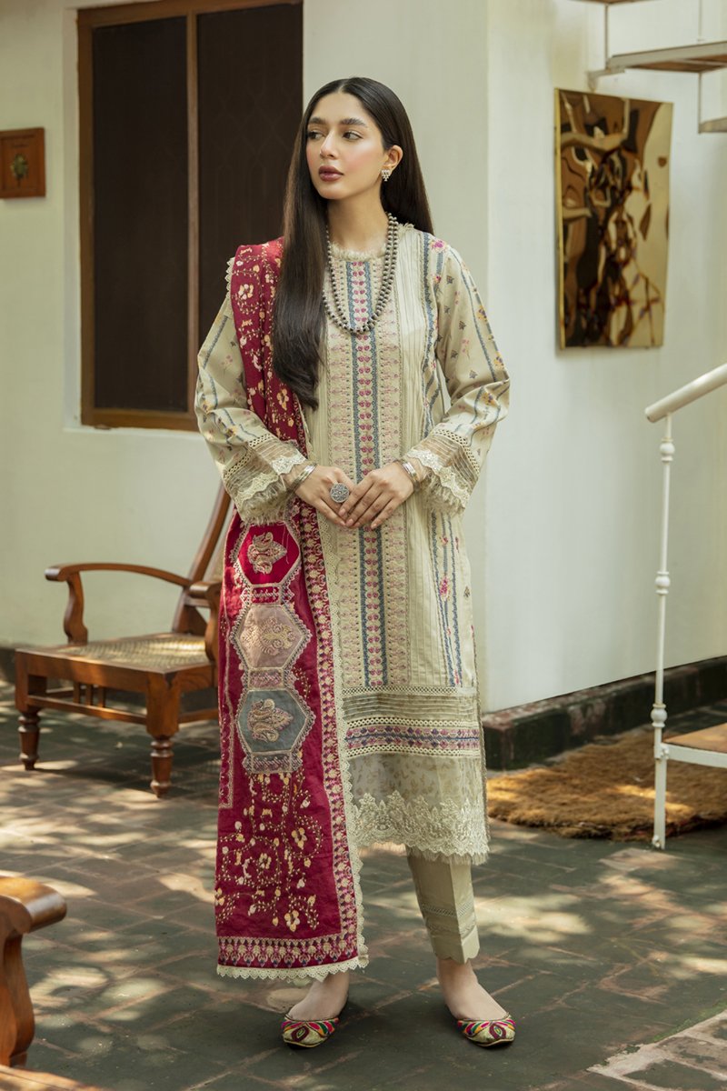 Fabric: Shirt Embroidered (Front) Embroidered lace (Front) Embroidered border (Front) Block printed organza border (Front & Sleeves) Block Printed (Back & Sleeves) Embroidered lace (Sleeves) Shawl Block Printed shawl Embroidered Motifs Trouser Plain Trouser |