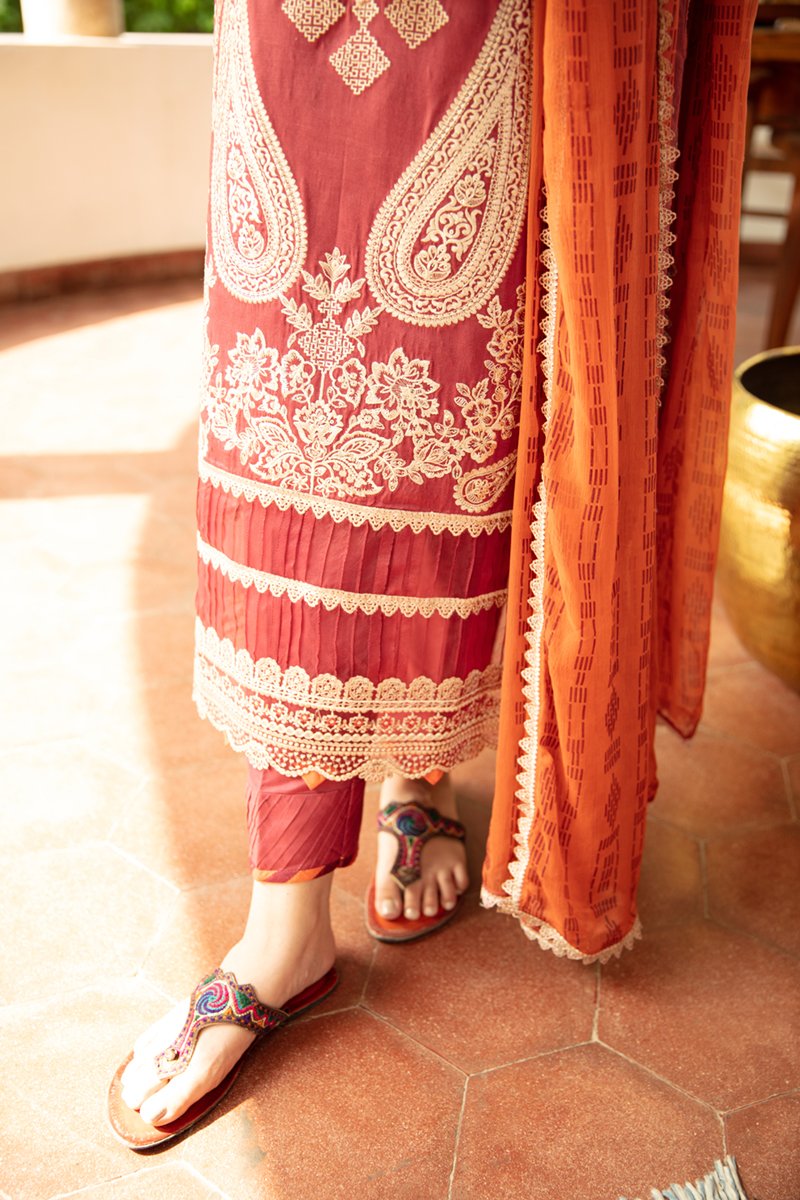 Fabric: Shirt Embroidered (Front) Embroidered lace (Front & Sleeves) Embroidered Border (Front & Sleeves) Hand loomed (Back) Plain Sleeves Plain organza Dupatta Block Printed Chiffon Trouser Plain Trouser |