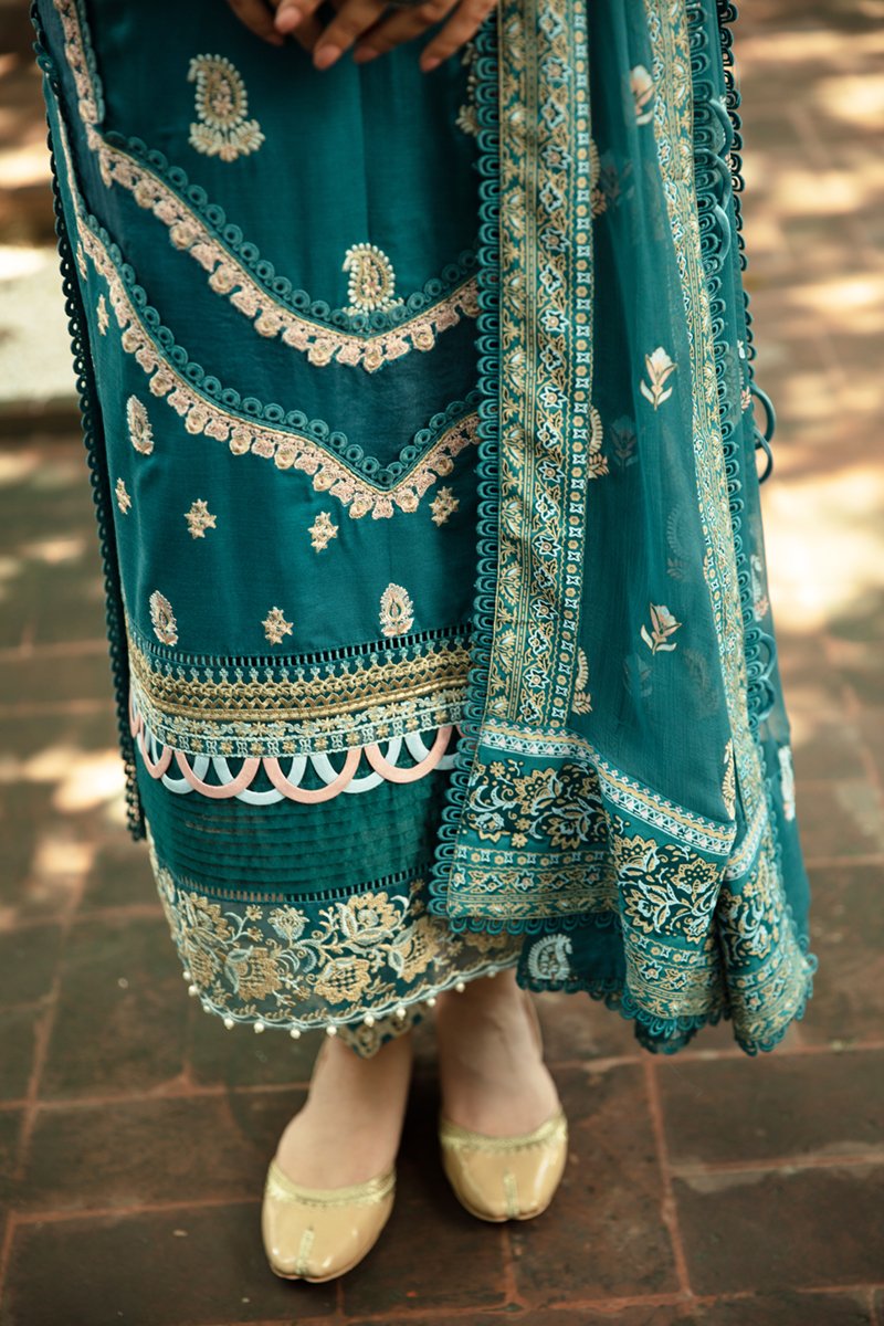 Fabric: Shirt Embroidered (Front) Embroidered Neckline Embroidered Front patch Embroidered border (Front and Sleeves) Embroidered lace (Front) Block Printed (Back) Embroidered (sleeves) Plain organza Dupatta Block printed Chiffon Block printed Pallu Block Printed Side Patti Trouser Plain Trouser Embroidered Trouser Patch |