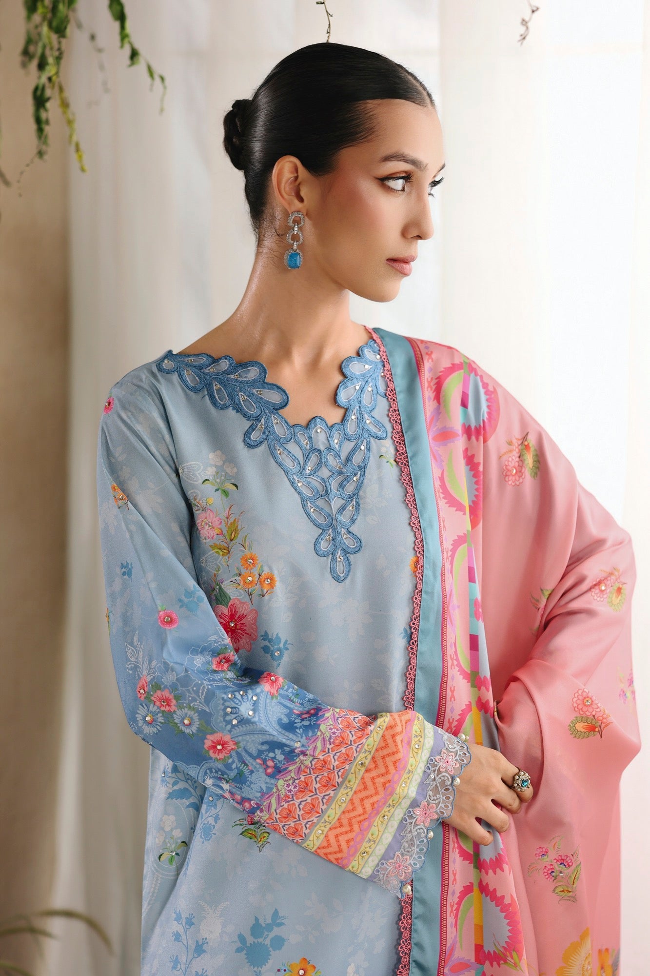 Summary: Discover elegance with the RajBari Silah Silk Edit, a stunning blue Pakistani suit. Crafted from luxurious raw silk, this ensemble is a perfect addition to your Spring/Summer wardrobe. The kameez captivates with its serene blue canvas, adorned with intricate prints and delicate hand embellishments on the front and sleeves. A beautifully embroidered and hand-embellished neckline adds a touch of regal charm. This sophisticated ethnic wear is a testament to exquisite Pakistani craftsmanship. Ideal for formal wear, Eid celebrations, or any festive gathering, this outfit ensures you stand out with grace and style.