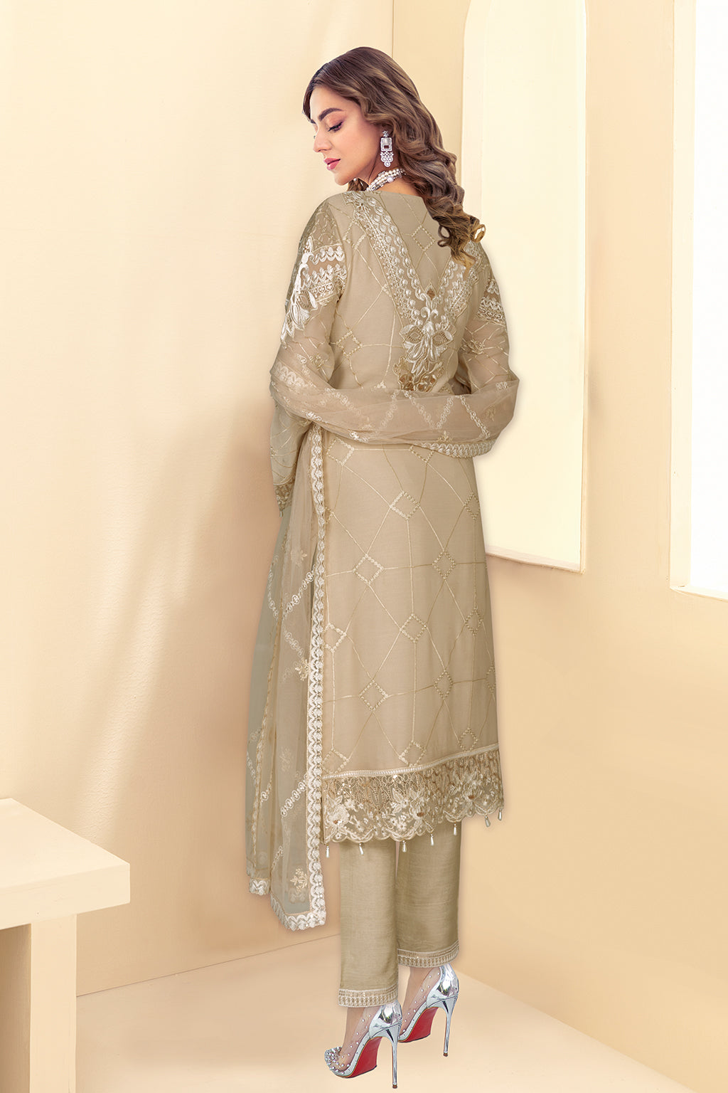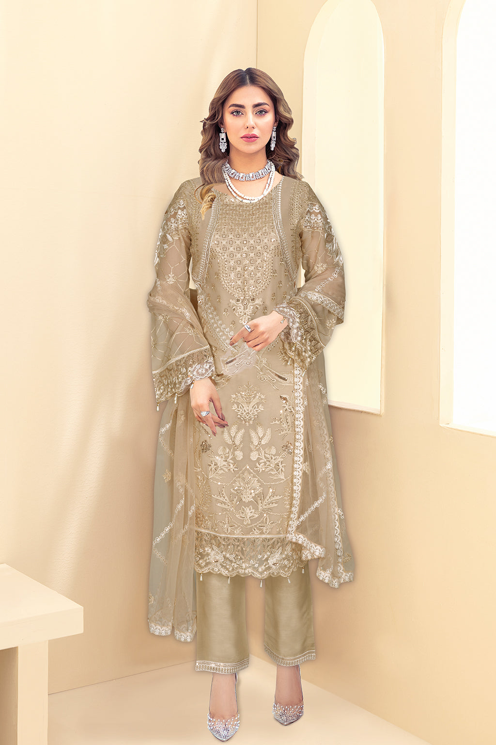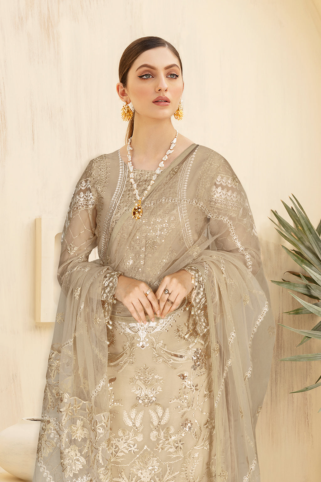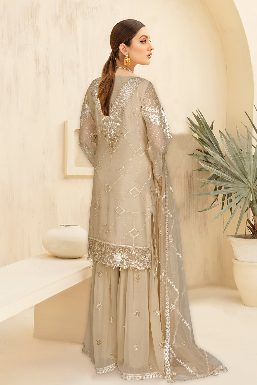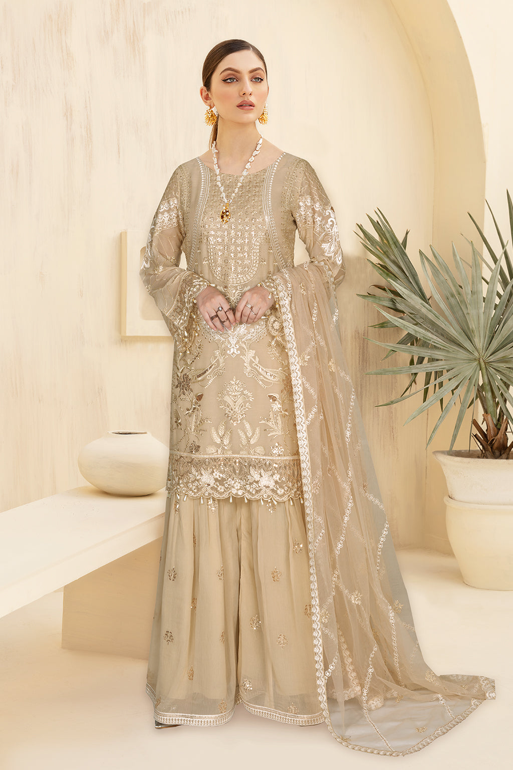 Fabric: Embroidered Chiffon front with sequins Embroidered Chiffon back with sequins & pasting Embroidered Chiffon sleeves with sequins & pasting Embroidered organza sleeves lace with sequins Embroidered organza ghera lace with sequins Embroidered chiffon fabric for gharara 3 yard Embroidered Net dupatta with sequins – 2.5 Meter Raw silk trouser – 2.5 Meter Embroidered organza trouser lace with sequins |