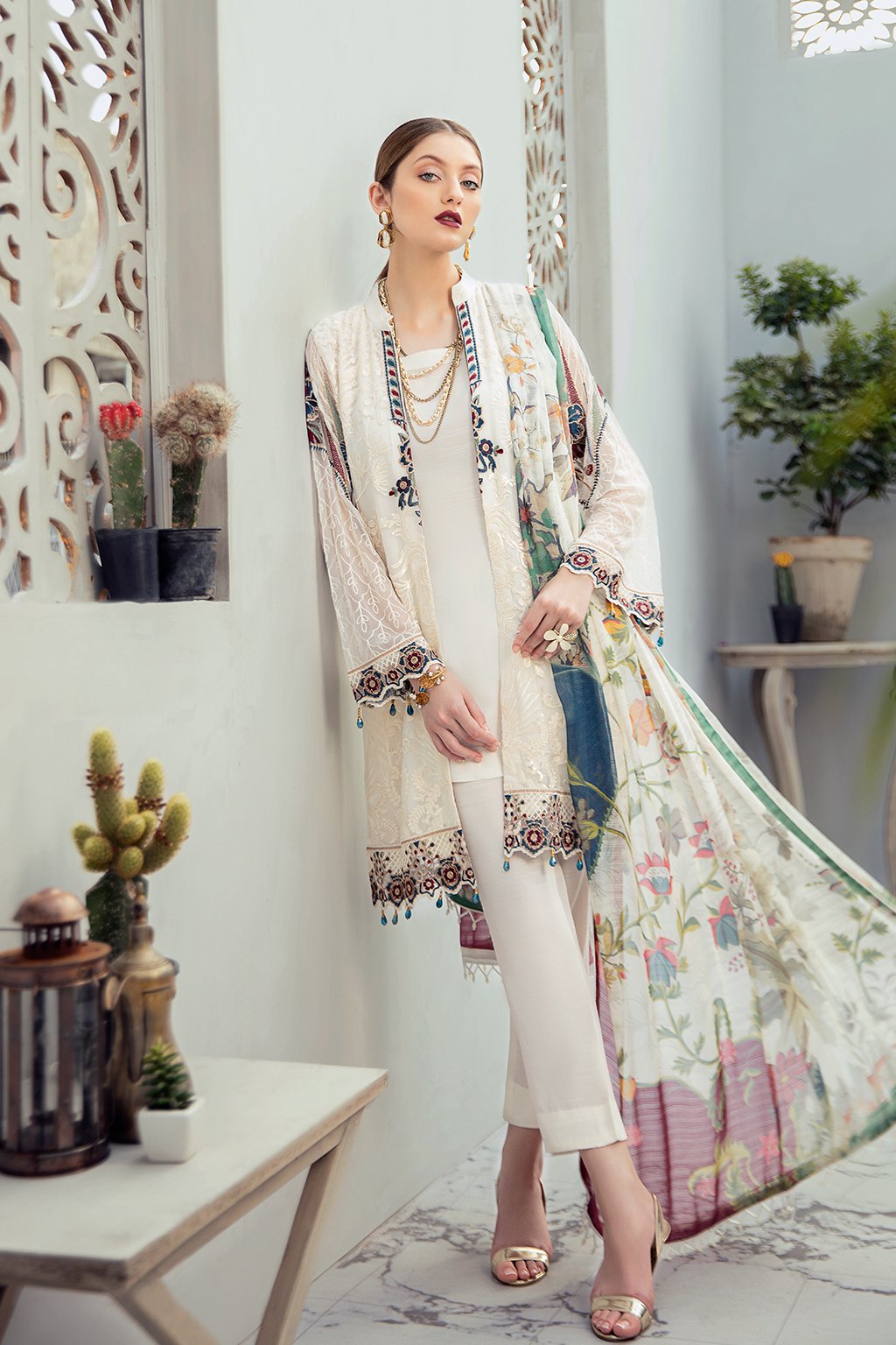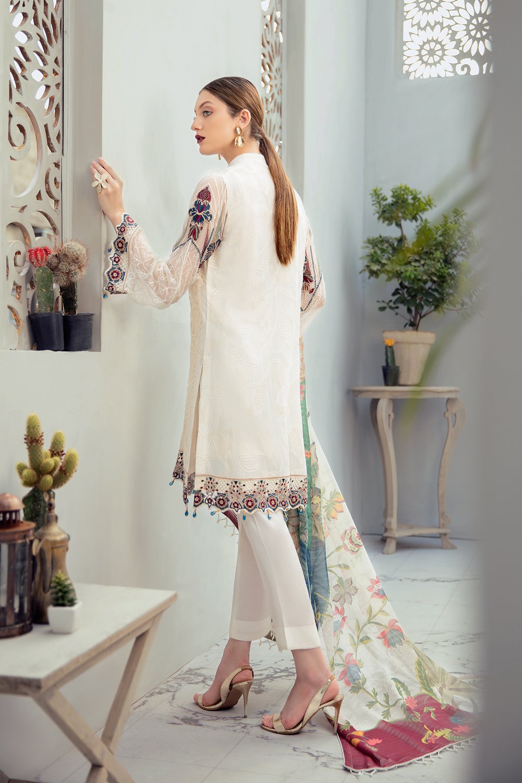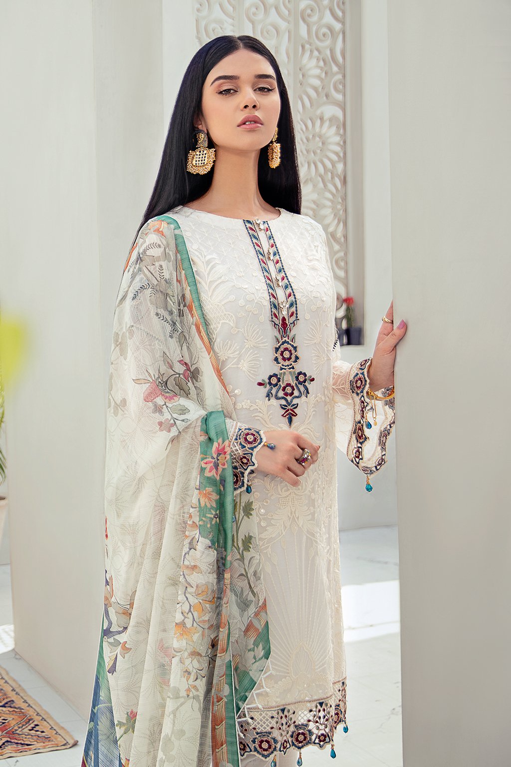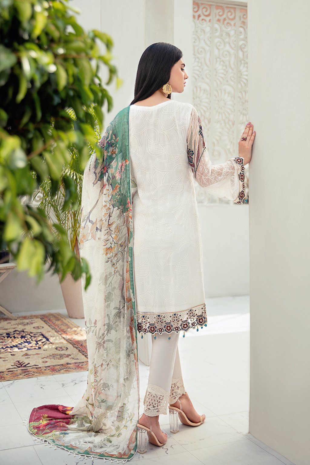Fabric: Embroidered Chiffon front with sequins Embroidered Chiffon back Embroidered Chiffon sleeves Embroidered tissue sleeves lace Embroidered tissue ghera lace Digital printed Chiffon dupatta – 2.5 Meter Raw silk trouser – 2.5 Meter Embroidered tissue trouser lace |