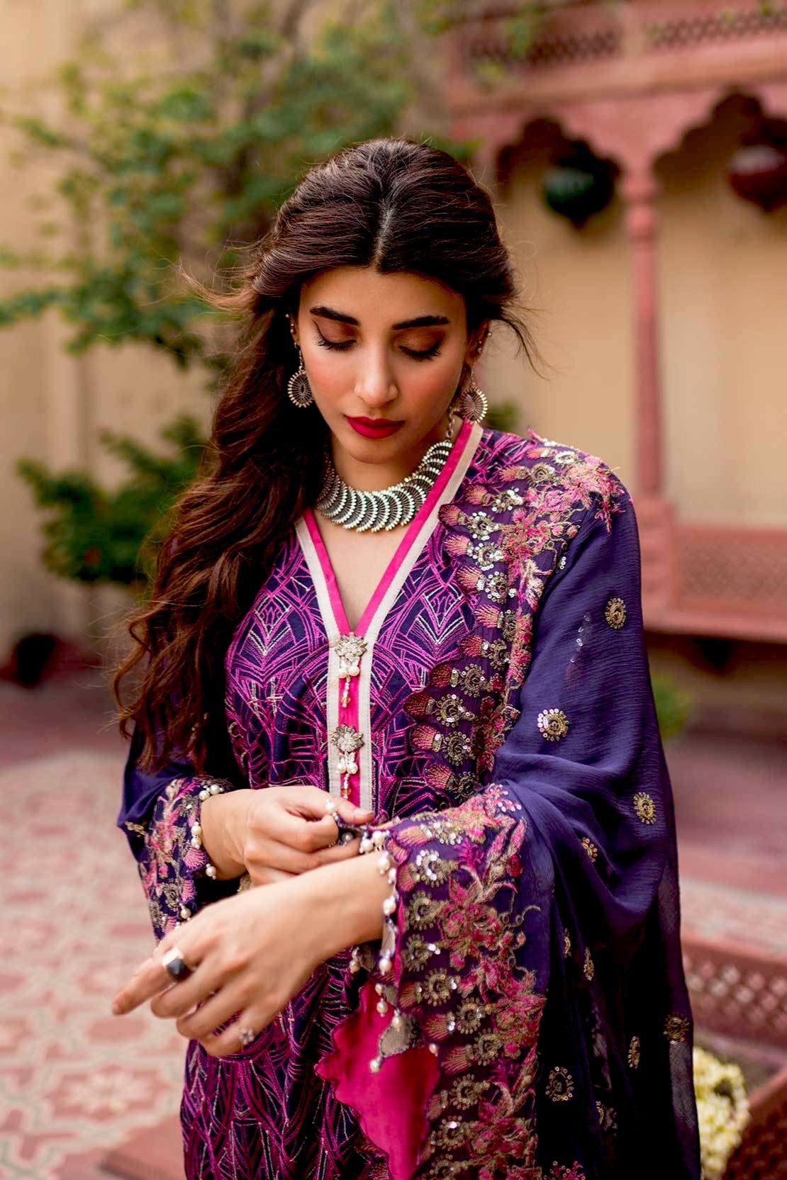 Fabric: Shirt Front Embroidered on Karandi 1.10 yards Shirt Back Embroidered on Karandi 1.25 yards Shirt Sleeves Embroidered on Karandi 0.70 yards Embroidered Bamber Chiffon Dupatta 2.65 yards Dyed Karandi Trouser 2.65 yards Shirt Front Emroidered Border on Karandi 30" 01 piece |