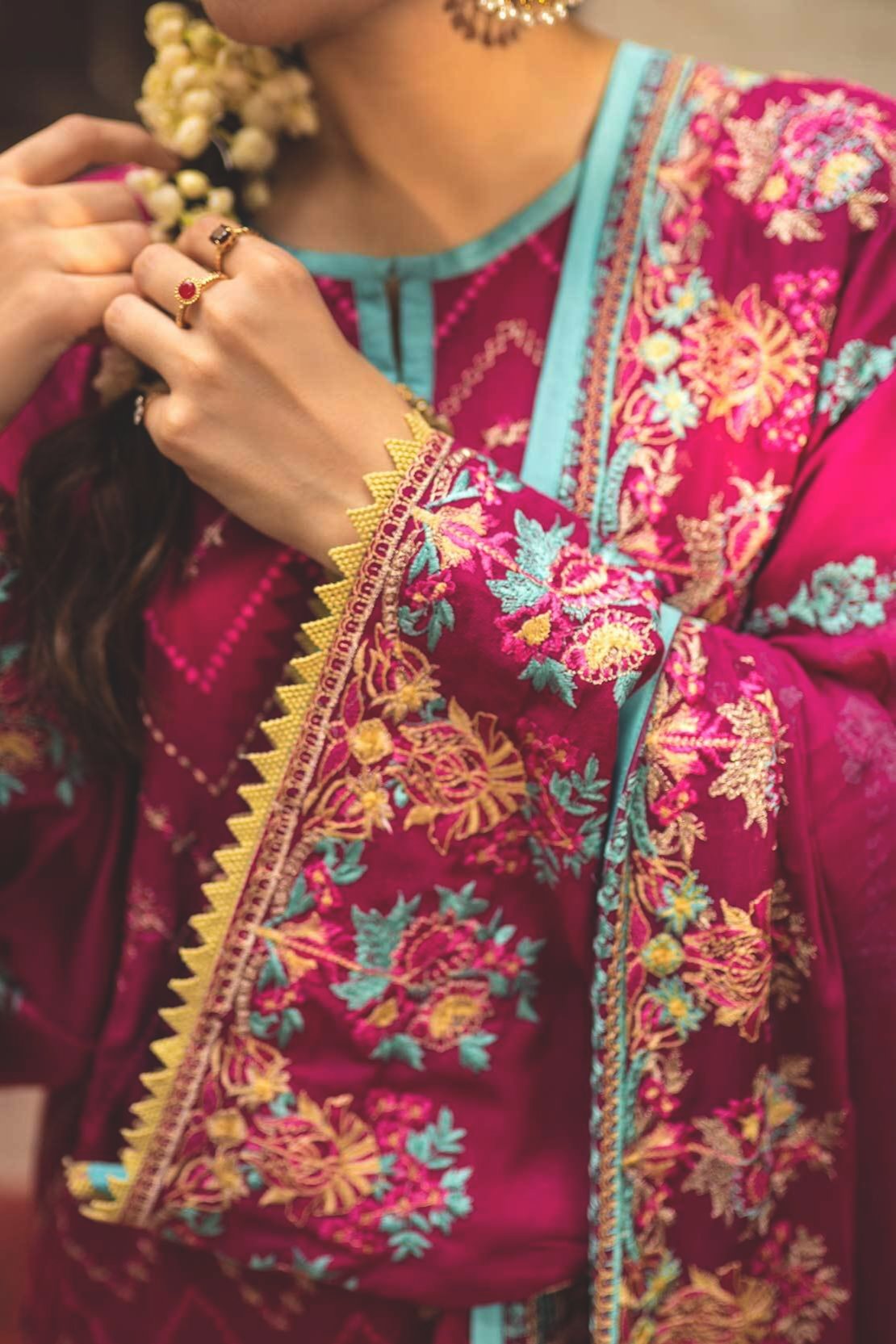 Fabric: Shirt Front Embroidered on Karandi 1.10 yards Shirt Back Embroidered on Karandi 1.10 yards Shirt Sleeves Embroidered on Karandi 0.70 yards Shirt Front Emroidered Border on Karandi 30" 01 piece Shirt Front Emroidered Border on Karandi 30" 01 piece Embroidered Bamber Chiffon Dupatta 2.65 yards Dyed Karandi Trouser 2.65 yards |