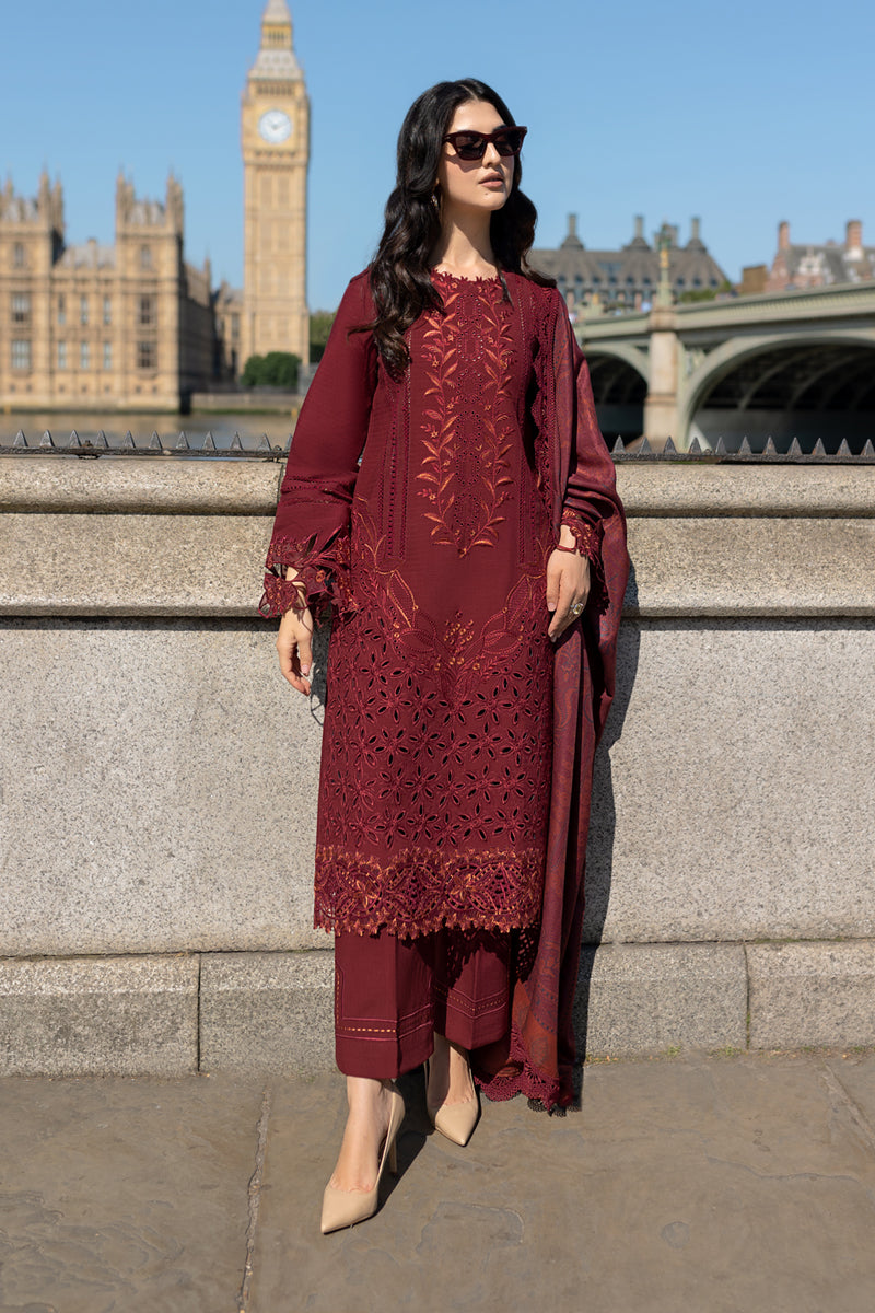 Fabric: Slub Linen Dyed Embroidered Shirt Front 50"" Dyed Organza Embroidered Front Border 33"" Dyed Organza Embroidered Sleeve Border 45"" Slub Linen Dyed Plain Back 48"" Slub Linen Dyed Plain Sleeve 26"" Dyed Plain Linen Trousers 2.5 Meters Woolen 2-Sided Print Shawl 2.5 Meters |