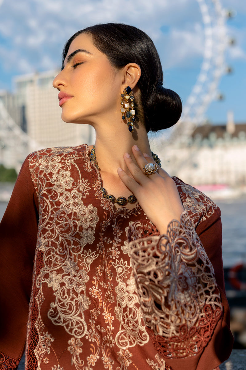 Fabric: Slub Linen Dyed Embroidered Shirt Front Centre Panel 47"" Slub Linen Dyed Embroidered Shirt Front Right Panel 47"" Slub Linen Dyed Embroidered Shirt Front Left Panel 47"" Dyed Organza Embroidered Front Motif 2Pc Dyed Organza Embroidered Sleeve Border 45"" Dyed Organza Embroidered Shirt Front Border 33"" Slub Linen Dyed Plain Back 48"" Slub Linen Dyed Plain Sleeve 26"" Dyed Plain Linen Trousers 2.5 Meters Woolen 2-Sided Print Shawl 2.5 Meters |