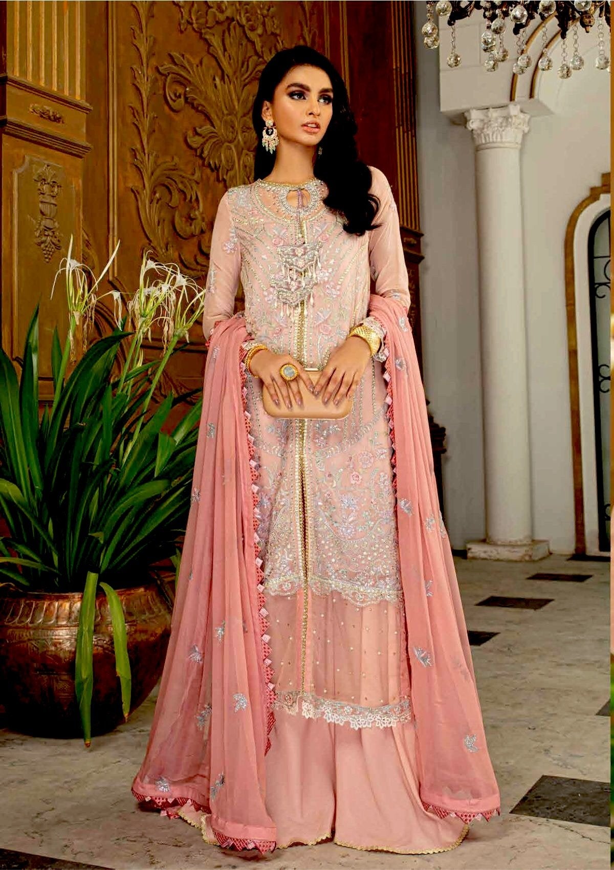 Fabric: Embroidered chiffon front Embroidered chiffon back Embroidered chiffon sleeves Embroidered border for daman Embroidered border for sleeves Embroidered neckline Embroidered chiffon dupatta Raw silk dyed trouser |