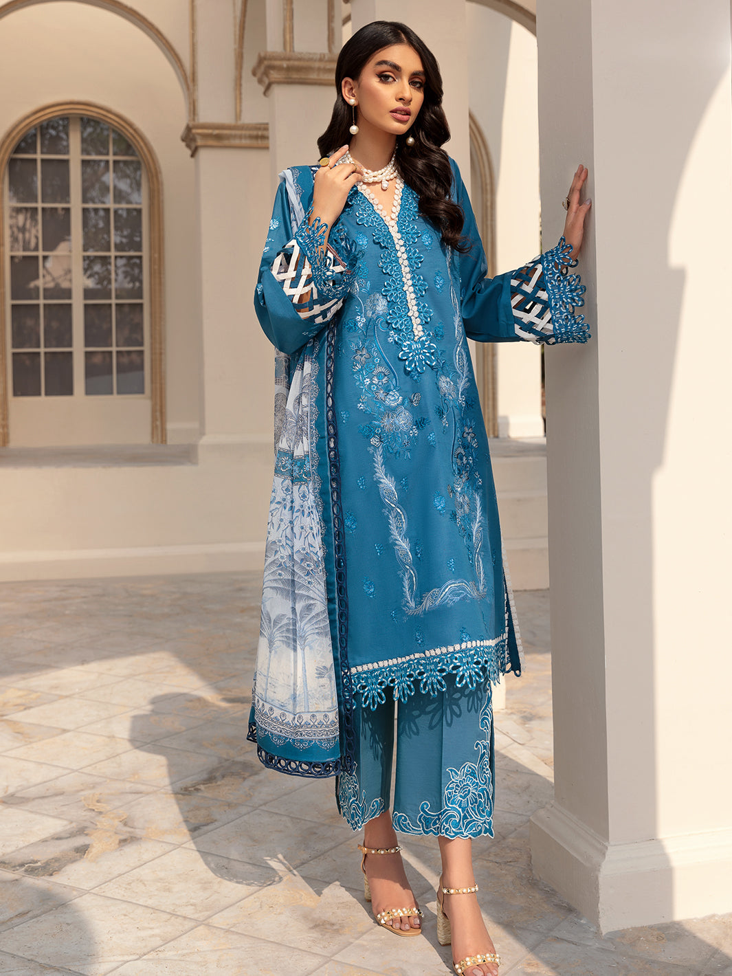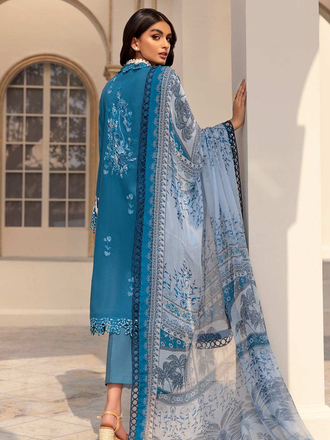 Fabric: Embroidered lawn front Embroidered lawn back Embroidered lawn sleeves Chikan embroidered front daman and back lace (organza) Embroidered neckline lace Embroidered back motif (organza) Embroidered trouser motif (organza) Digital print chiffon dupatta Dyed cotton trouser |