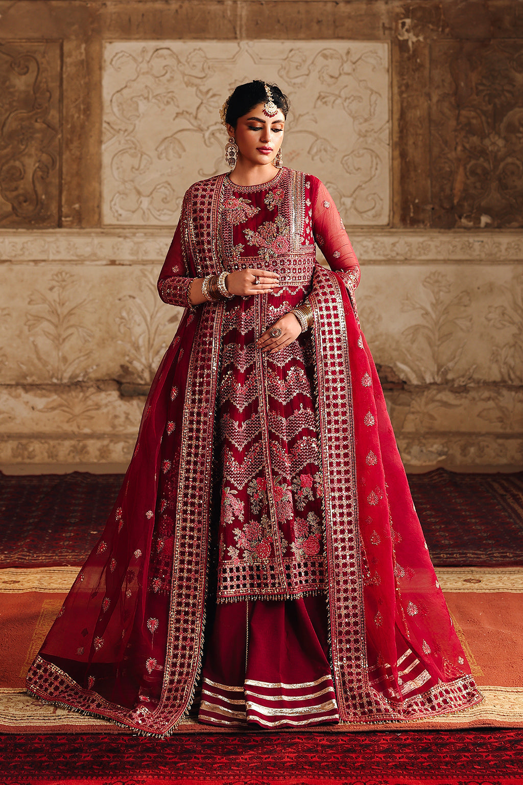 Summary: Embrace regal elegance with 'Dure' from Saad Shaikh's Silsila Luxury Festive Formals. This exquisite Pakistani suit is presented in a deep, captivating maroon hue. Crafted from delicate organza, its lightweight and airy feel makes it perfect for spring/summer celebrations. The unstitched ensemble features a heavily embroidered and hand-embellished bodice, panels, and sleeves, showcasing meticulous craftsmanship. The rich maroon color and opulent design make this formal wear an impeccable choice for wedding festivities and grand events, establishing it as a masterpiece of Pakistani ethnic wear.