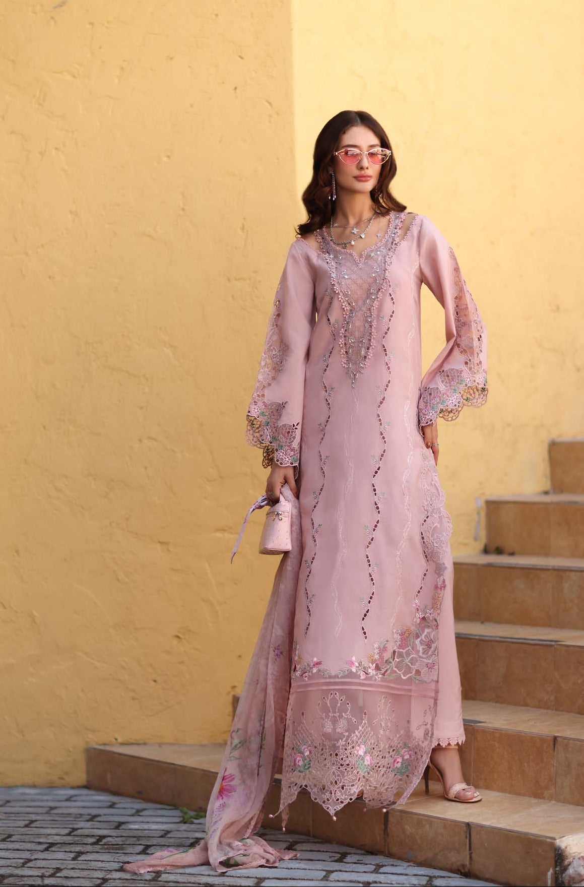 Summary: Embrace refined elegance with this exquisite pink Pakistani Lawn Suit from Saadia Asad's Noor collection. This formal wear masterpiece is crafted from premium lawn, a lightweight and breathable fabric perfect for the Spring/Summer season. The kameez features intricate Schiffli embroidery across the front, highlighted with delicate sequins for a soft shimmer. A beautifully detailed embroidered neckline with floral motifs and cut-out details adds depth and artisanal charm. This stunning Pakistani dress, with its lace-inspired borders, is a perfect example of festive clothing. Ideal for Eid celebrations, daytime weddings, or any formal event.