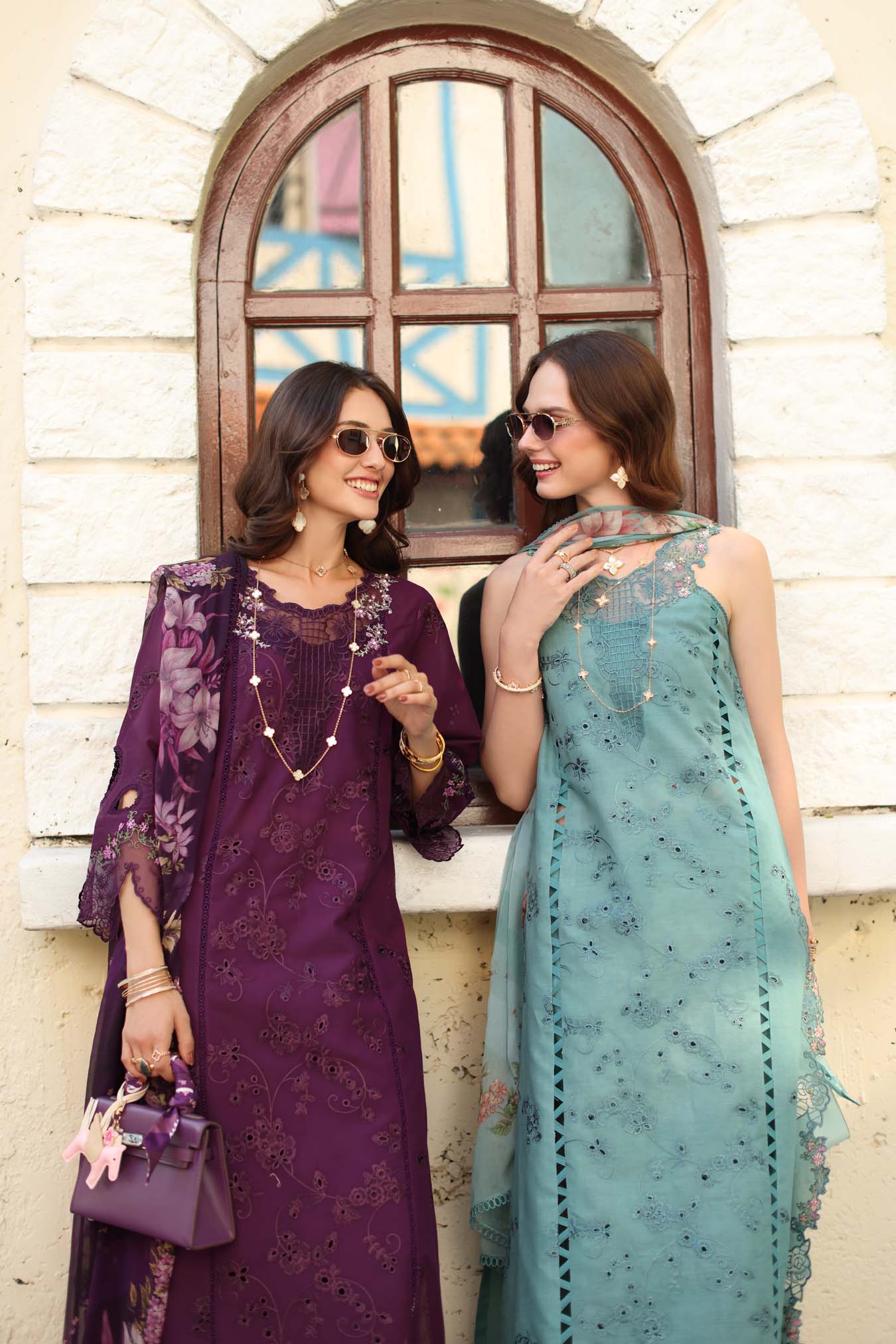 Fabric: 3 piece unstitched lawn embroidered suit Shirt Fabric: Lawn - A lightweight, breathable fabric with a soft, lustrous finish. Trouser Fabric: Cambric - A fine, tightly-woven cotton fabric that’s soft, smooth, and lightweight Dupatta Fabric: Chiffon-Lightweight, sheer and ideal for summer season Details: Schiffli embroidered lawn center front & side panels Dyed lawn back Embroidered lawn sleeves Dyed cambric trouser Digital printed chiffon dupatta Embroidered neckline Embroidered scalloped hem border Embroidered sleeves border Description: The design in deep Mulberry hue features a schiffli-embroidered center panel with delicate spray motifs, complemented by an embroidered neckline with subtle hints of color. A wide border in shades of pink and lilac completes the look, while schiffli-embroidered sleeves with lace-like borders add elegance. The ensemble is paired with a digitally printed chiffon dupatta for a graceful finish. |