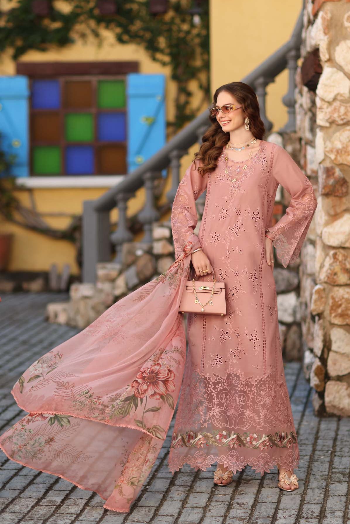 Summary: Embrace elegance with this stunning Petal Pink Pakistani Suit by Saadia Asad. Crafted from luxurious Lawn fabric, this summer outfit is designed for breathability and comfort. The kameez features a rich, fully schiffli jaal embroidered center panel, complemented by delicate spray motifs on the sides. Intricate lace-inspired and floral borders adorn the hemline, while artisanal patches elevate the neckline and sleeves. This exquisite Pakistani Lawn Dress is a perfect example of festive wear, ideal for Eid celebrations, summer weddings, or formal day events, offering a graceful and sophisticated ethnic look.