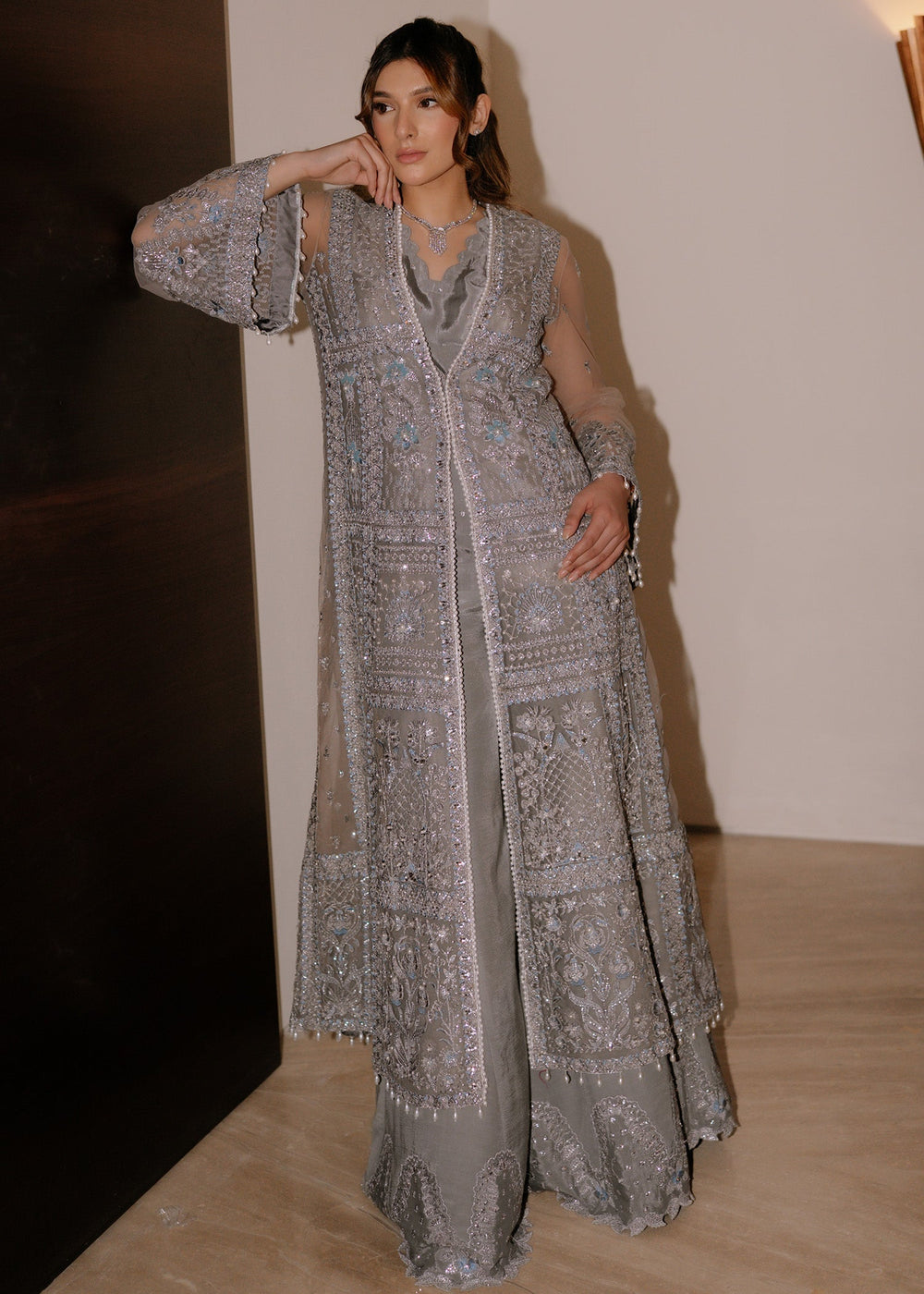 Summary: Embrace ethereal elegance with the 'Overcast Whisper' Pakistani suit by Sadaf Fawad Khan. This exquisite festive formal outfit features a stunning grey Net gown, intricately adorned with detailed handwork and embroidery. The lightweight and breathable Net fabric makes it a perfect choice for Spring/Summer celebrations. The sophisticated grey tone offers a modern twist on traditional ethnic wear, making this Pakistani dress a standout piece for weddings, receptions, and Eid festivities. Its luxurious design and craftsmanship ensure you make a memorable statement at any formal event. This is the ideal ensemble for those seeking grace and opulence in their festive clothing.