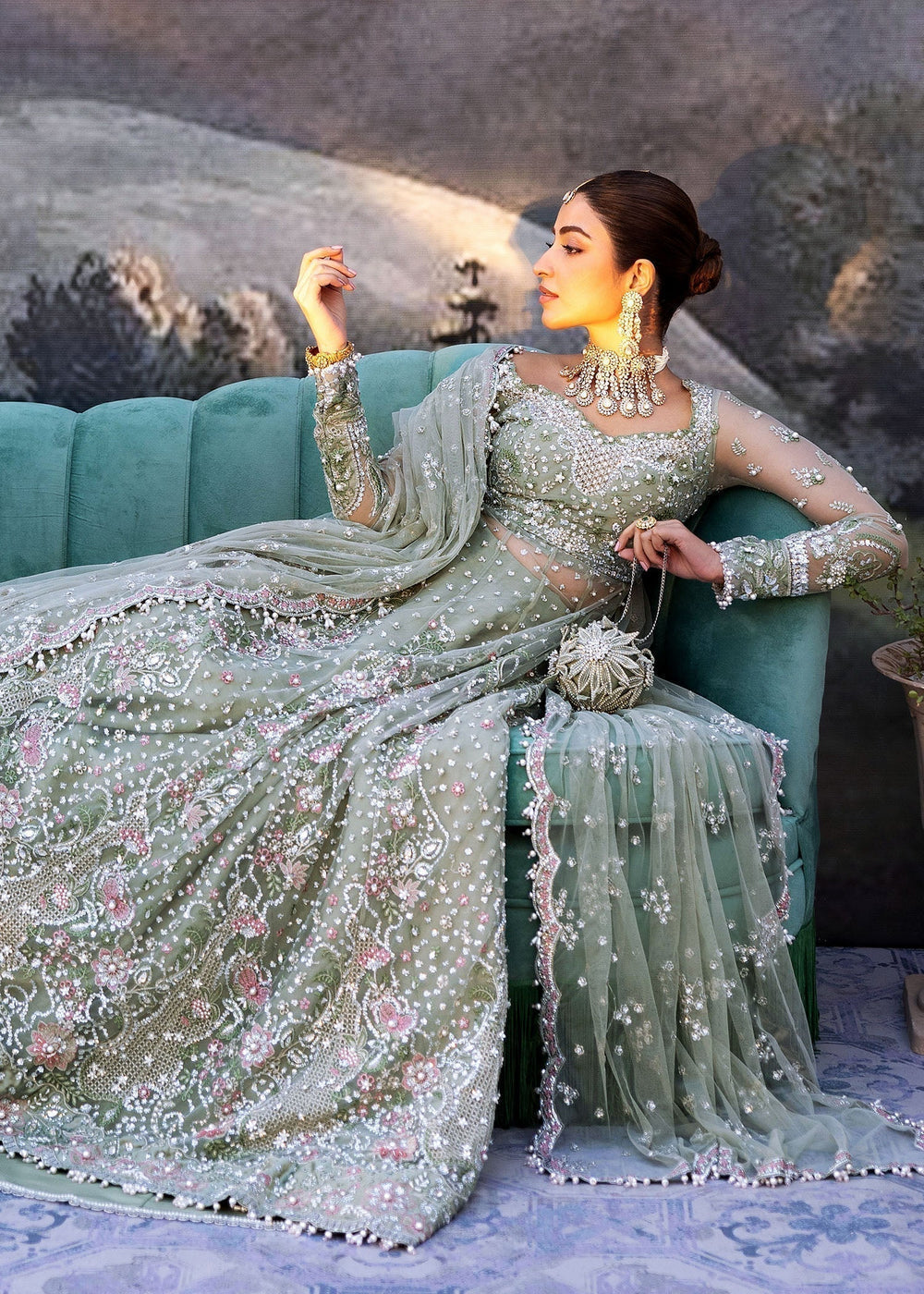 Summary: Embrace festive elegance with the 'Siraa' luxury formal by Sadaf Fawad Khan. This stunning Pakistani suit shines in a sophisticated Sea Green shade, crafted from delicate Net fabric perfect for Spring/Summer celebrations. The gown-style kameez is a masterpiece of design, featuring a fully handworked bodice and sleeves, complemented by intricately embroidered panels. The ethereal Net material ensures both comfort and a graceful flow. This ethnic wear, with its serene green tone, is an exquisite choice for Mehndi ceremonies or wedding guest attire. A perfect blend of tradition and luxury, this outfit is ideal for anyone looking to buy premium Pakistani festive wear.