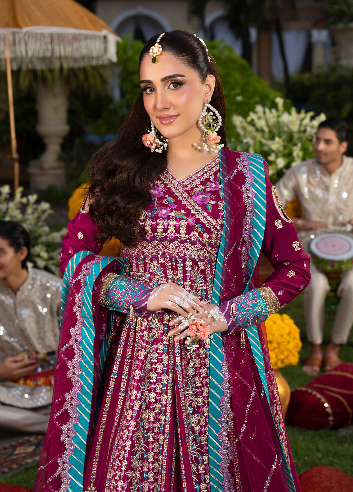 Summary: Experience regal elegance with Sahane's 'Song of Joy', a magnificent Pakistani suit from their Luxury Wedding Formals collection. This stunning magenta dress is crafted from premium raw silk, ideal for spring/summer festivities. The kameez is a masterpiece of design, featuring intricate sequins embroidery on the body, sleeves, and across seven graceful kalis on both the front and back. The rich color and luxurious fabric make this ethnic wear perfect for weddings and formal celebrations. Elevate your festive wardrobe with this exquisite Pakistani dress, a symbol of timeless grace and opulence.