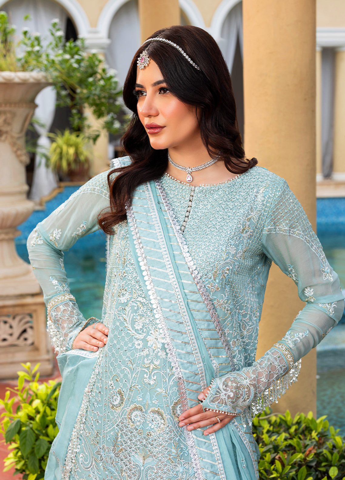 Summary: Embrace ethereal elegance with this stunning Sea Green Pakistani suit from the Sahane 'Luxury Wedding Formals' collection. This unstitched ensemble is crafted from delicate chiffon, a lightweight fabric ideal for spring and summer festivities. The kameez is a work of art, featuring intricate sequins embroidery across the front, back, and full sleeves, exuding opulence. The serene Sea Green hue makes this ethnic wear a sophisticated choice for formal events and wedding celebrations. Paired with a crushed lehenga, this outfit offers a graceful silhouette. This is the ideal choice for anyone looking to buy a luxurious Pakistani dress for Eid or a wedding.