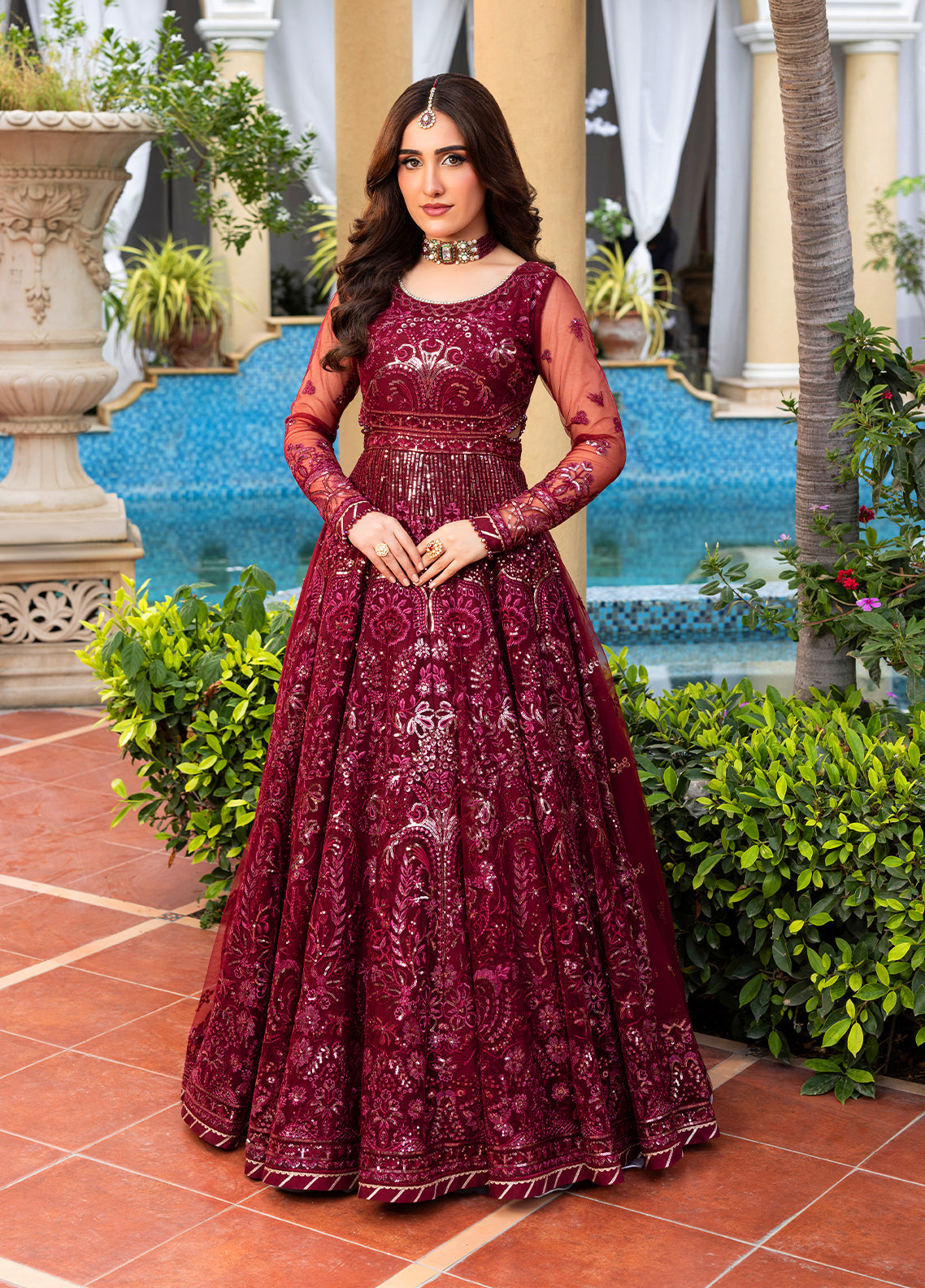 Summary: Embrace regal elegance with this stunning maroon Pakistani suit from the Sahane Haye Dil collection. This luxurious formal wear is crafted from delicate Net fabric, making it a surprisingly comfortable choice for Spring/Summer weddings. The entire kameez, from the front and back body to the flowing kalis and sleeves, is lavishly adorned with intricate sequins embroidery, creating a dazzling effect. The deep maroon shade is synonymous with South Asian wedding festivities, making this ethnic outfit a perfect choice for a Barat ceremony or a formal reception. This unstitched dress promises a sophisticated and memorable appearance.