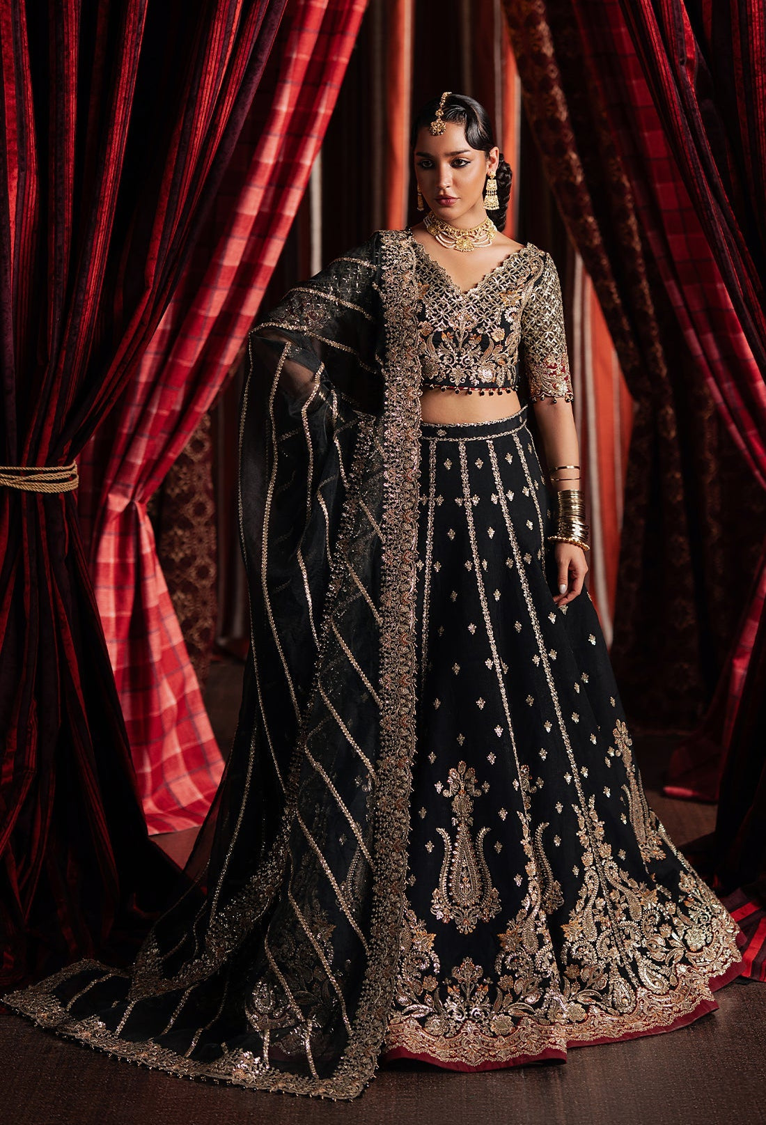 Summary: Embrace regal elegance with this black Pakistani bridal wear from the Afrozeh Divani Silk Edit. This 'Gulraiz' outfit is a masterpiece of luxury formals, featuring an exquisite raw silk shirt. The silk fabric provides a lustrous sheen and graceful structure, suitable for high-end Spring/Summer events. The deep black hue symbolizes sophistication, making this ethnic wear perfect for grand evening functions, receptions, and wedding celebrations. This Pakistani dress is an impeccable choice for a bride or a guest aiming to make a memorable statement at any formal gathering.