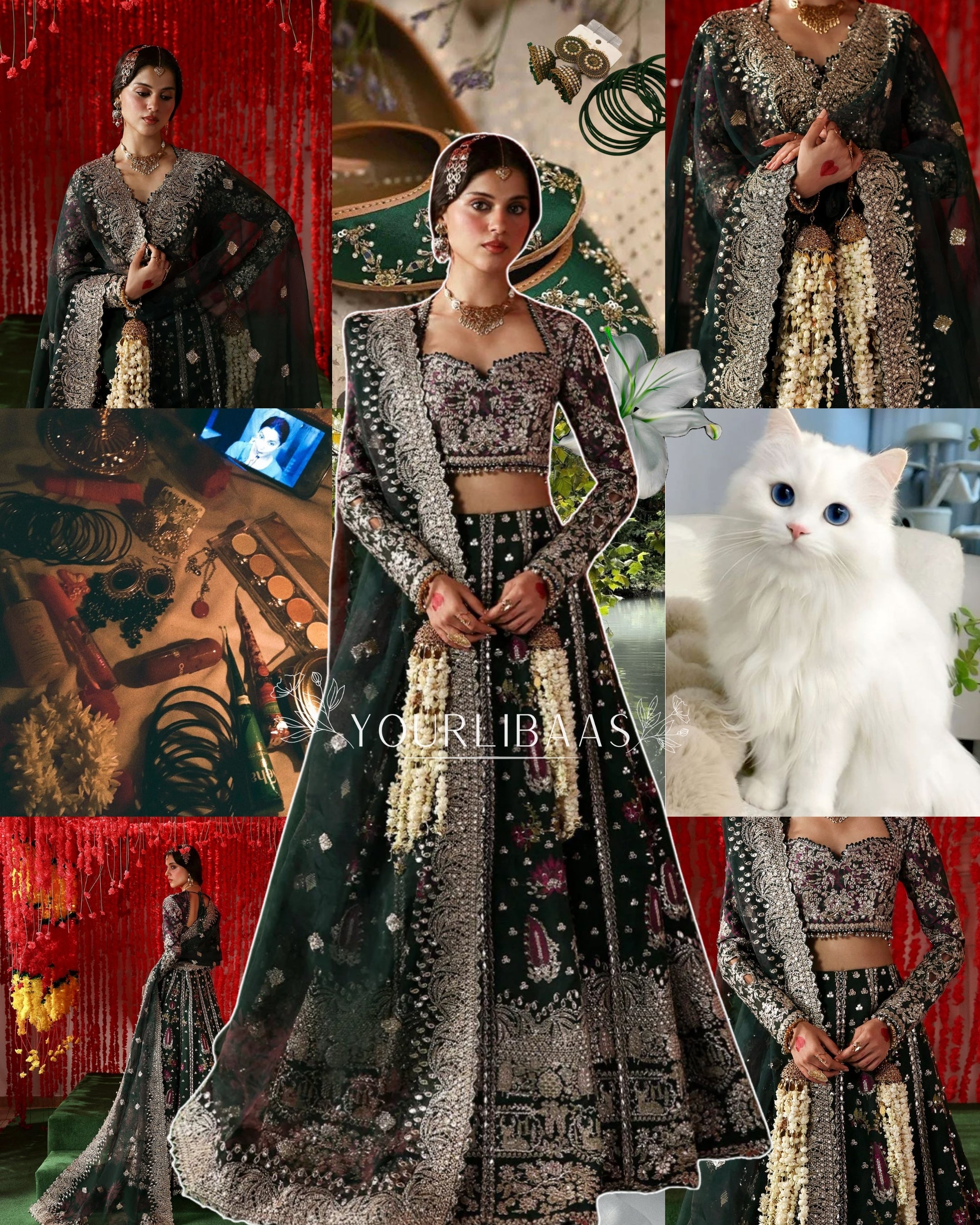 Summary: Step into a fairytale with this exquisite dark green Pakistani bridal dress from the Afrozeh Shehnai collection. This opulent ensemble features a beautifully crafted raw silk choli and sleeves, paired with flowing embroidered organza panels that create a majestic silhouette. The deep green shade is culturally significant for Mehndi ceremonies, making this the perfect bridal outfit. Designed with luxurious fabrics suitable for Spring/Summer celebrations, this ethnic wear is the pinnacle of wedding formals. A timeless choice for any bride looking to make a grand statement.