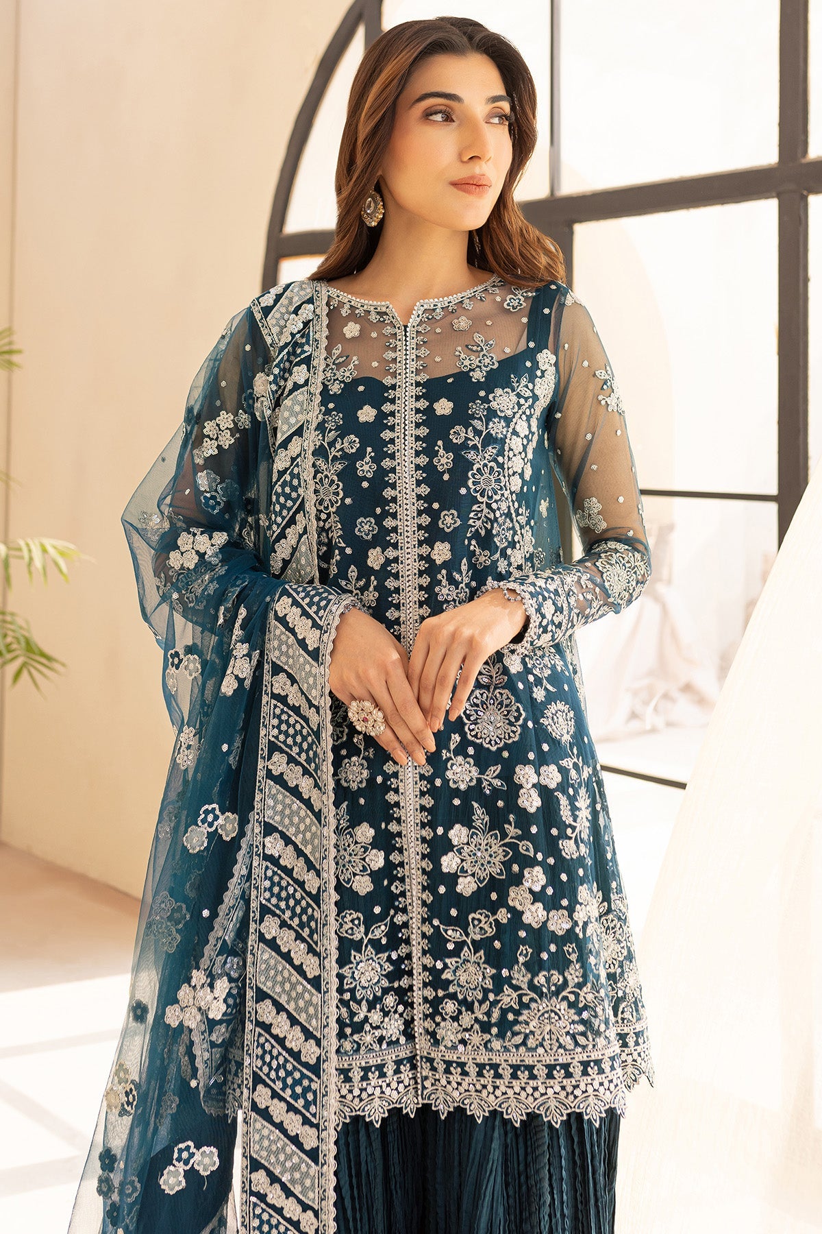 Summary: Experience timeless elegance with the 'Lu-Zella' luxury formal Pakistani suit by Farasha. This exquisite ensemble features a stunning teal kameez crafted from delicate embroidered net, perfect for the Spring/Summer season. The shirt is adorned with intricate floral embroidery, showcasing masterful craftsmanship. This unstitched Pakistani dress offers a sophisticated silhouette, making it an ideal choice for formal wear. The rich teal hue lends a regal touch, suitable for wedding wear or exclusive party wear. Elevate your ethnic wear collection with this beautiful festive outfit, perfect for making a statement at any celebration.