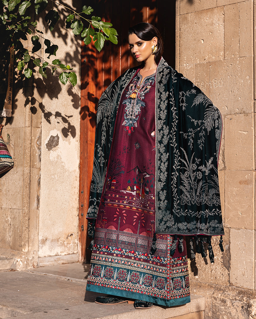 Summary: Embrace winter elegance with this stunning maroon Pakistani suit from Esmel's 'Lueur D'Orient Winter' collection. The kameez is crafted from rich Jacquard viscose, a fabric known for its intricate weave and warmth, making it ideal for the Fall/Winter season. This Pakistani dress features exquisite silk embroidery on the neckline, front and back daman, and sleeves, adding a layer of sophisticated detail. As a quintessential piece of ethnic formal wear, this ensemble is perfect for winter weddings, festive gatherings, and formal dinners. A truly elegant choice for your festive clothing wardrobe.