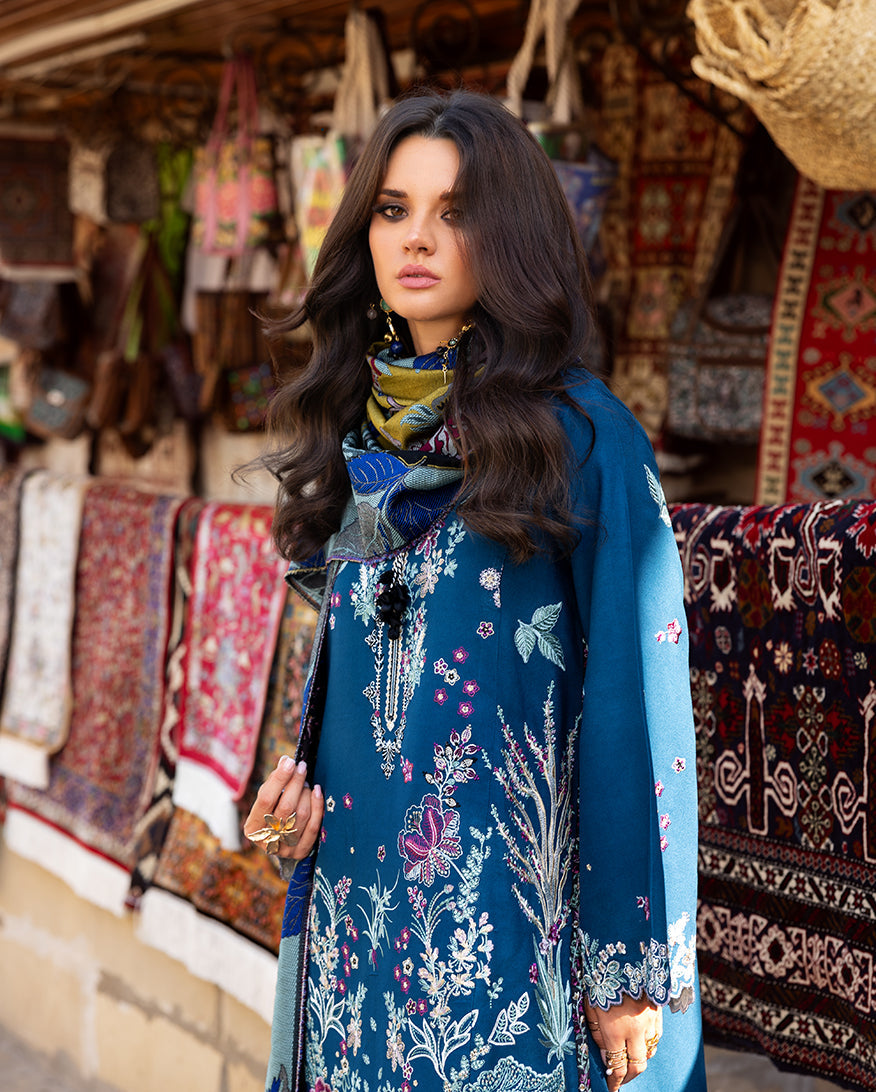 Summary: Step into sophistication with the Esmel Veyra Pakistani Suit, a highlight from the Lueur D'Orient Winter collection. This formal wear masterpiece features a rich teal shirt crafted from luxurious crepe, perfect for the colder seasons. The kameez is adorned with intricate floral embroidery on the front panels and sleeves, complemented by a delicate silk border. Handmade wool tassels on the neckline add a bespoke touch to this elegant ethnic outfit. As a premier example of Pakistani winter fashion, this unstitched ensemble is an ideal choice for formal dinners, festive gatherings, and evening parties.