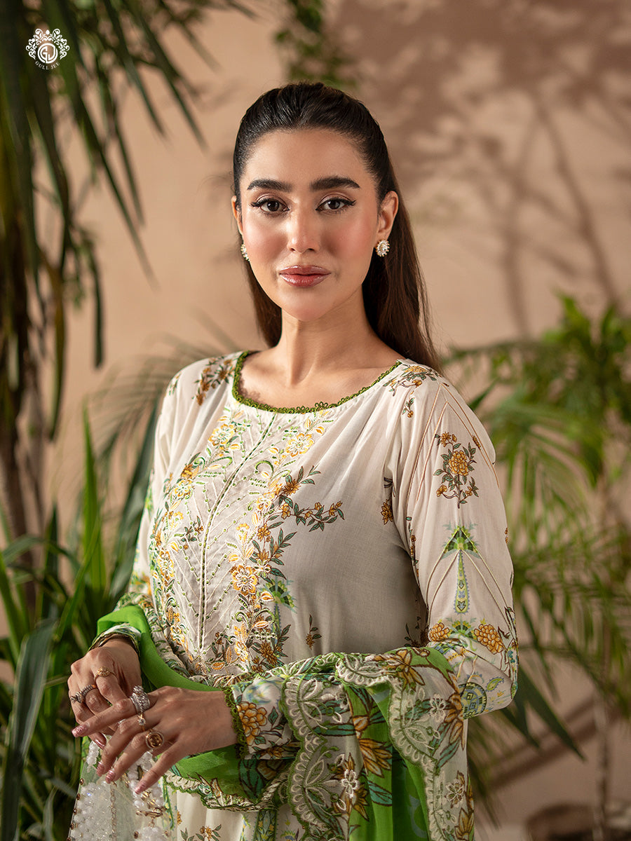 Summary: Embrace sophisticated charm with this GullJee Rang Pasand Pakistani suit. The ensemble features a beautiful off-white kameez crafted from premium digital printed lawn, renowned for its lightweight and breathable feel, making it an ideal choice for the Spring/Summer season. The shirt is adorned with delicate neck embroidery, adding a touch of formal elegance. This Pakistani lawn dress, with its serene color palette, is perfect for daytime formal events, festive gatherings like Eid, or as chic ethnic wear. This unstitched suit offers a canvas for creating a timeless and graceful summer outfit.