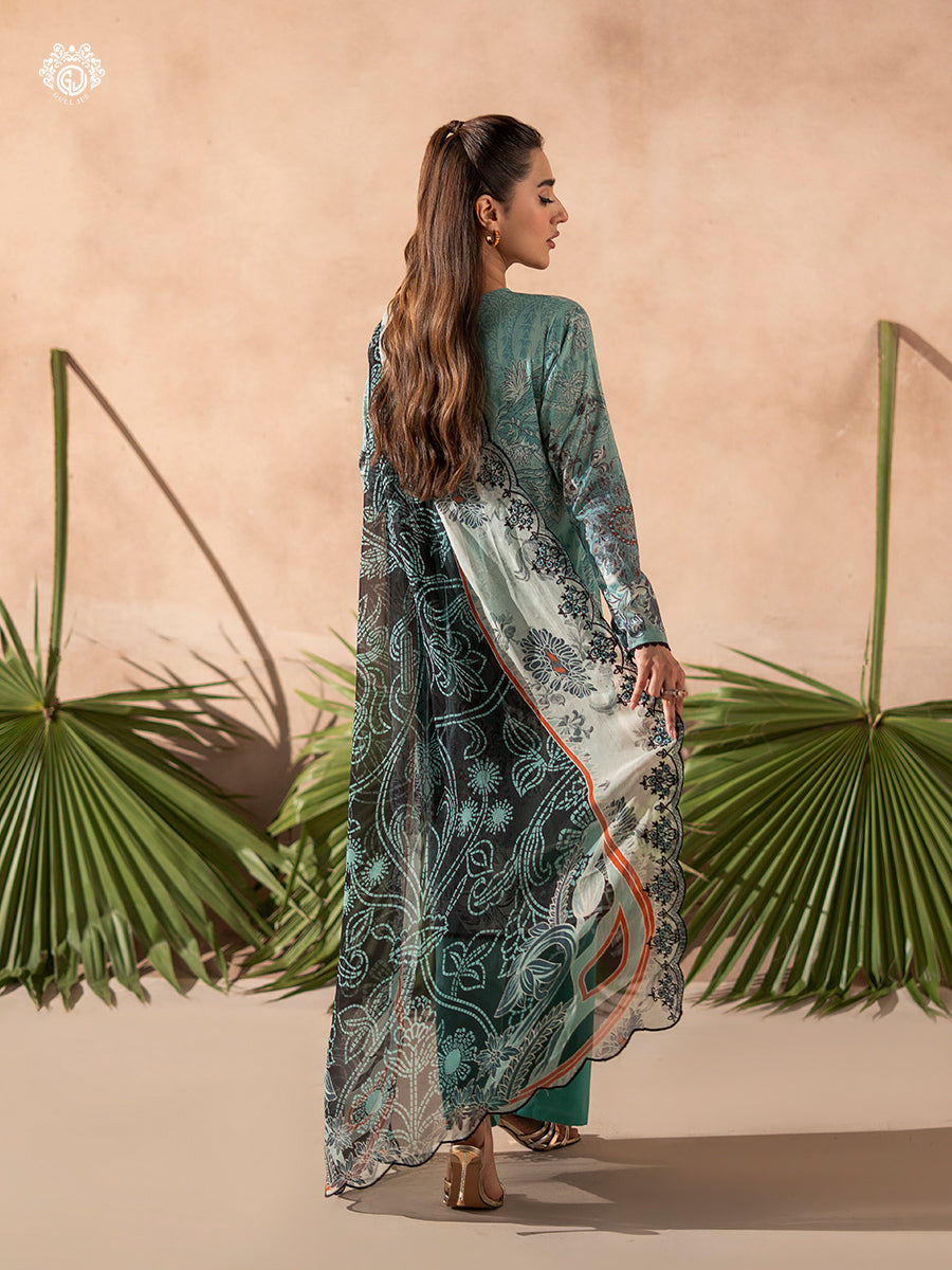 Summary: Embrace summer elegance with this stunning Sea Green Pakistani Lawn Suit by GullJee from the Rang Pasand collection. Crafted from high-quality, breathable lawn fabric, this unstitched dress is designed for comfort during the warmer Spring/Summer months. The kameez features a sophisticated digital print, beautifully accentuated by intricate embroidery on the neckline, adding a touch of formal grace. This ethnic wear masterpiece is a perfect blend of traditional artistry and modern design, making it a versatile addition to your festive wardrobe. Ideal for Eid celebrations, daytime parties, or as elegant festive wear, this outfit promises a chic and graceful look.