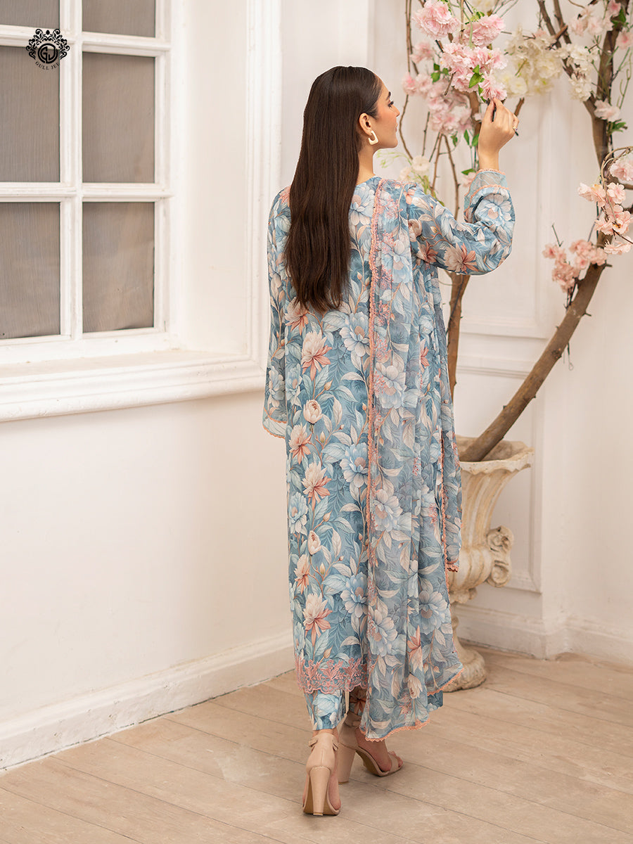 Summary: Embrace seasonal elegance with the GullJee Ziva Lawn – 2520A12, a beautiful Pakistani suit. The kameez, crafted from breathable digital printed lawn, features a serene blue canvas adorned with a soft floral print. This summer outfit is enhanced with exquisite organza embroidery on the neck and front lace, adding a touch of formal grace. As a versatile piece of ethnic wear, this Pakistani lawn dress is perfect for the warmer months. Its sophisticated design makes it an ideal choice for daytime parties, festive gatherings, or Eid celebrations, offering a blend of comfort and high-end style.