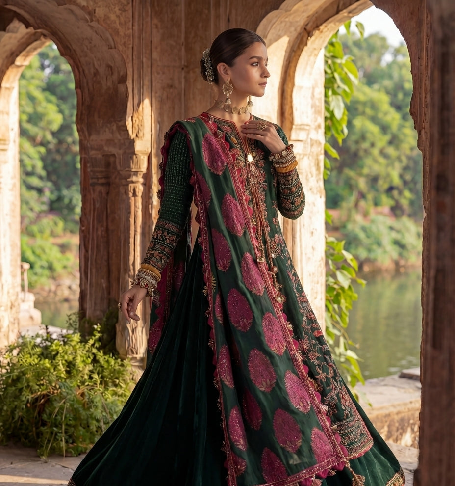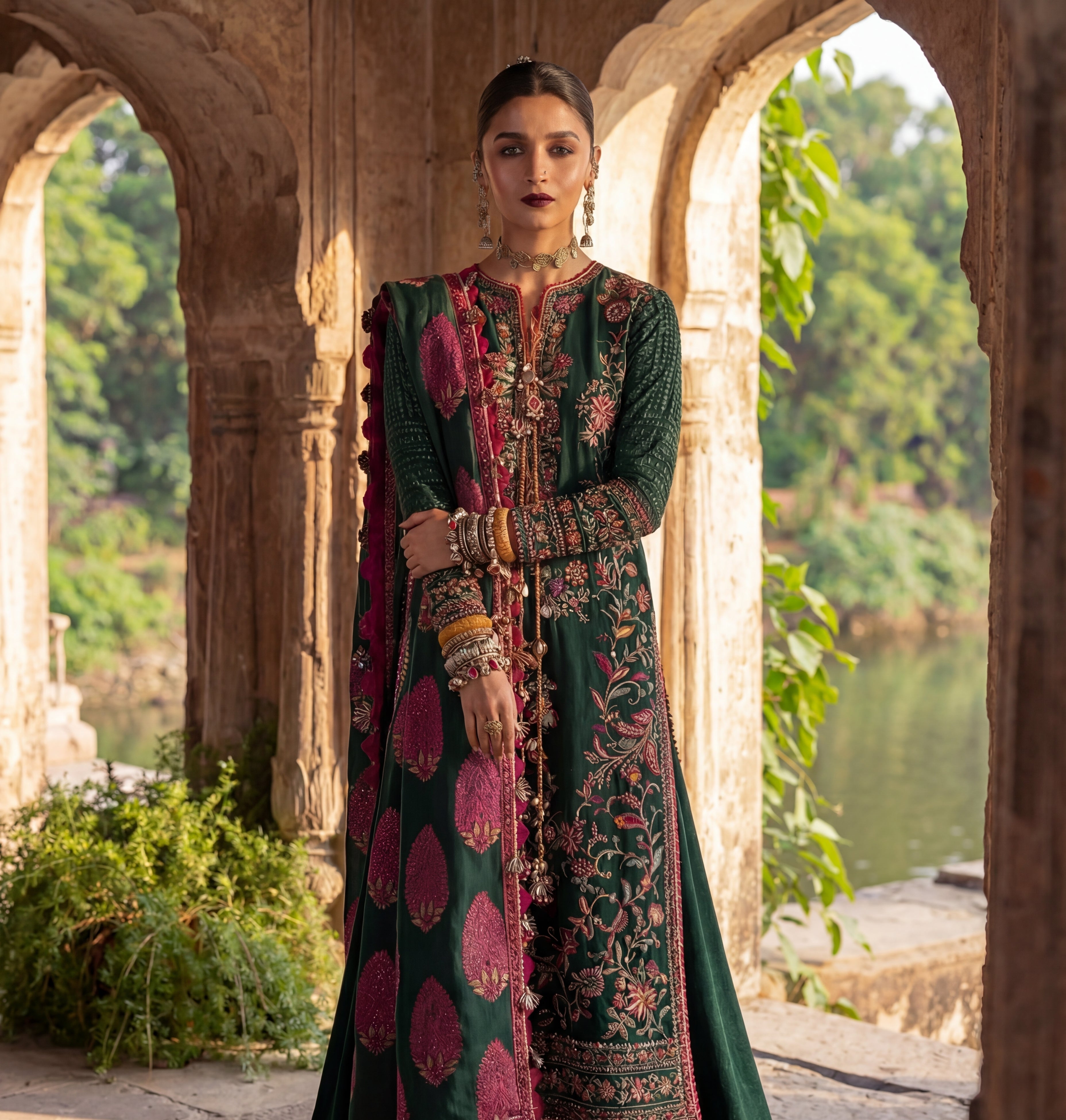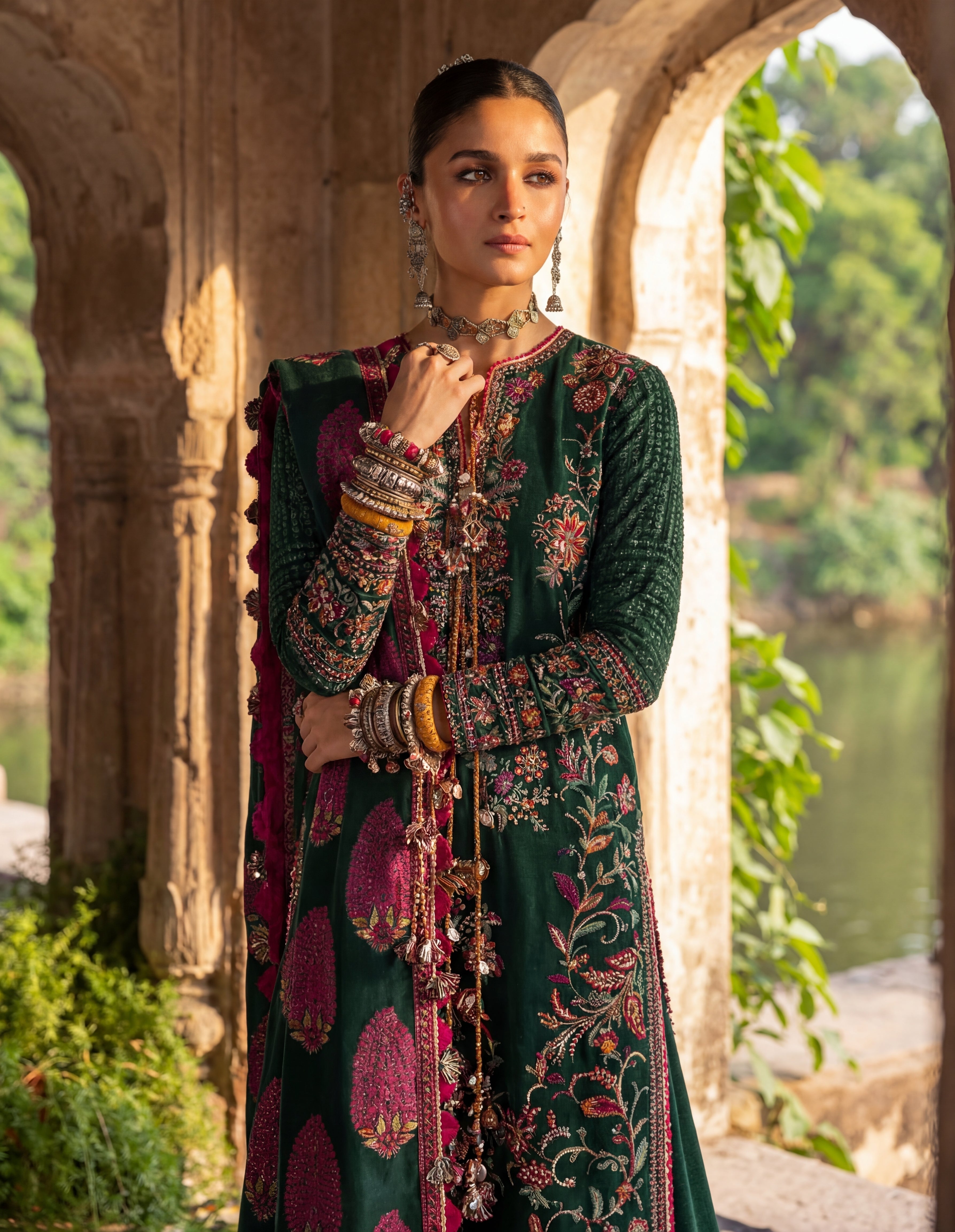 Summary: Discover the elegance of this Hussain Rehar Pakistani Suit in a deep, enchanting green. Crafted from premium Karandi fabric, this unstitched dress is perfect for the Fall/Winter season, offering both warmth and style. The kameez is a masterpiece of design, featuring intricate embroidery on the front panels, back, and sleeves, creating a sophisticated texture. This green ethnic wear is a stunning choice for formal events and wedding festivities, particularly as a Mehndi outfit. Shop this exquisite Pakistani dress online to command attention with effortless grace at your next celebration.