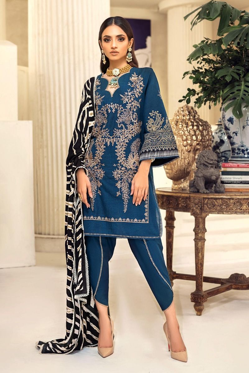A midnight blue and apple crunch slub shirt is printed in Moroccan motifs and geometric inspired patterns. Apple crunch embroidery on a midnight blue base resound in Moroccan motifs over the shirt front. A bold monochromatic animal printed kani shawl adds a quirky flair to the ensemble, and complements the midnight blue cotton pants. The animal print shawl is daring, bold and ready to be styled to perfection. |