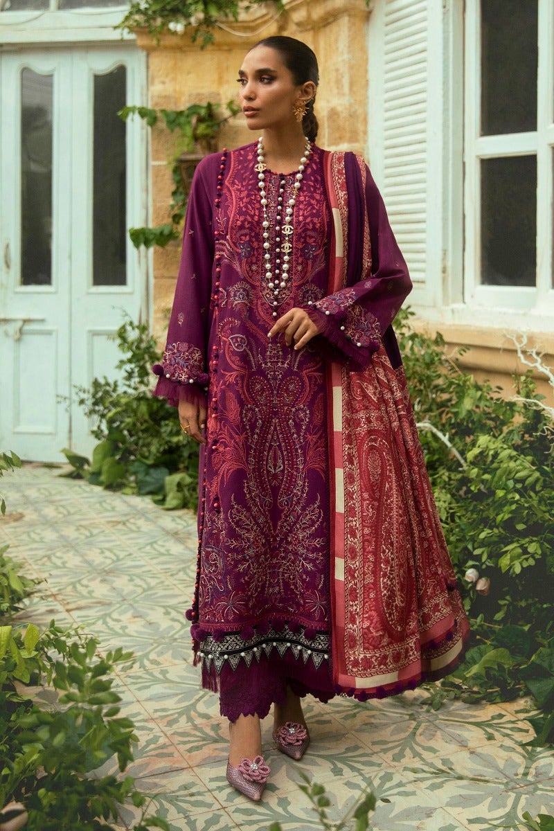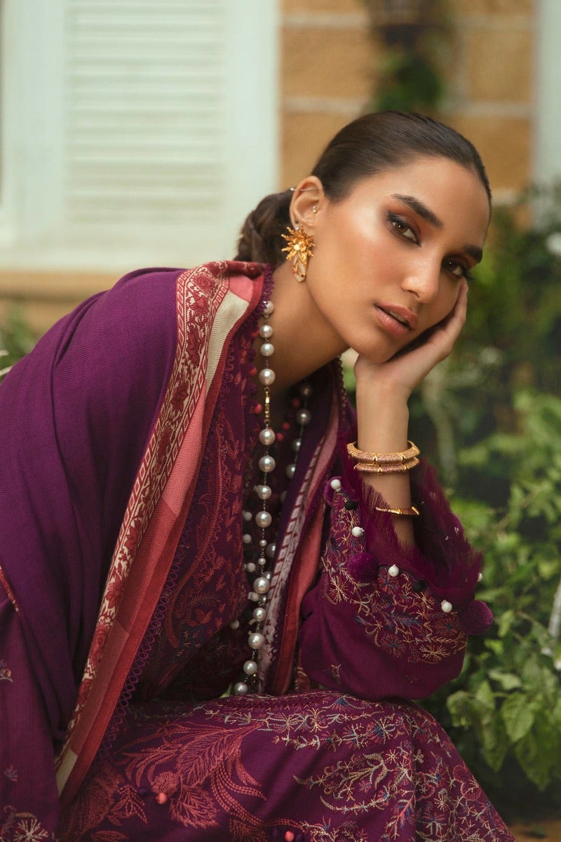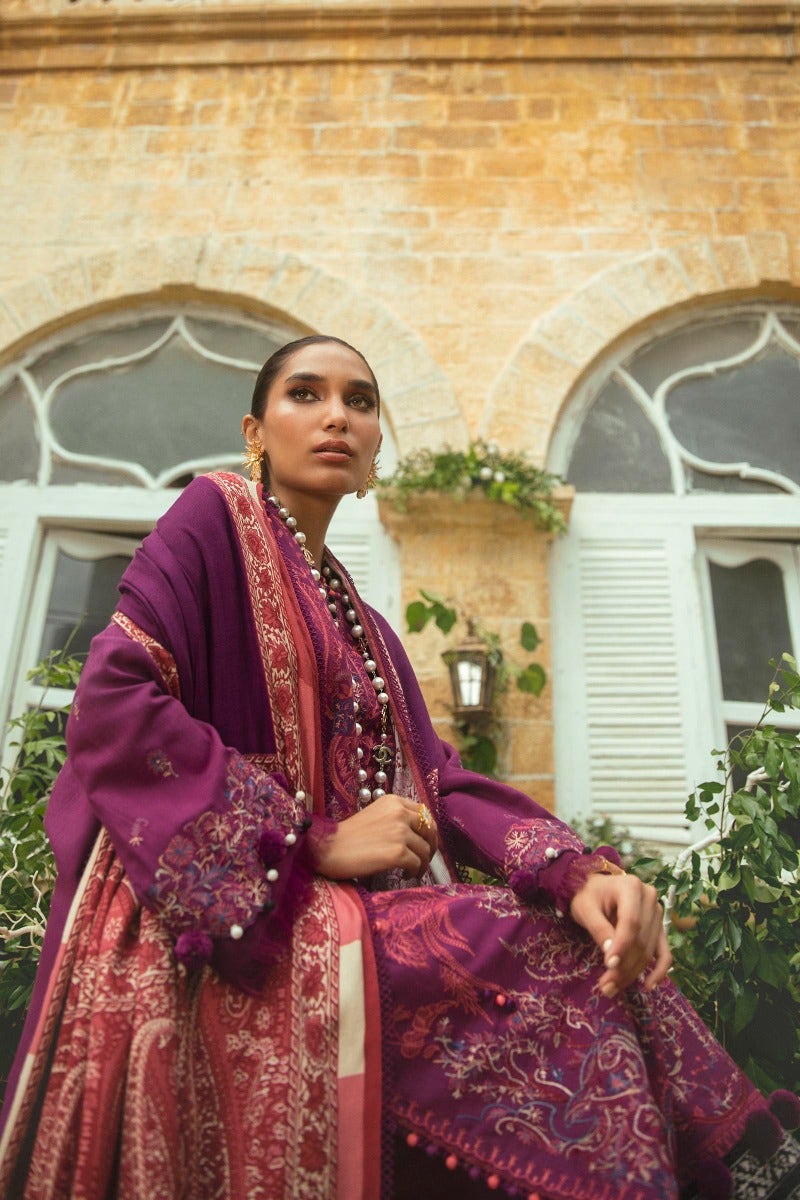 Elegant floral embroidery in shades of coral, maroon, cream, sage, and blue on a striking and bold plum canvas. This amazing ensemble, when coupled with plum pants and a beautiful pashmina shawl, makes a strong impression.
