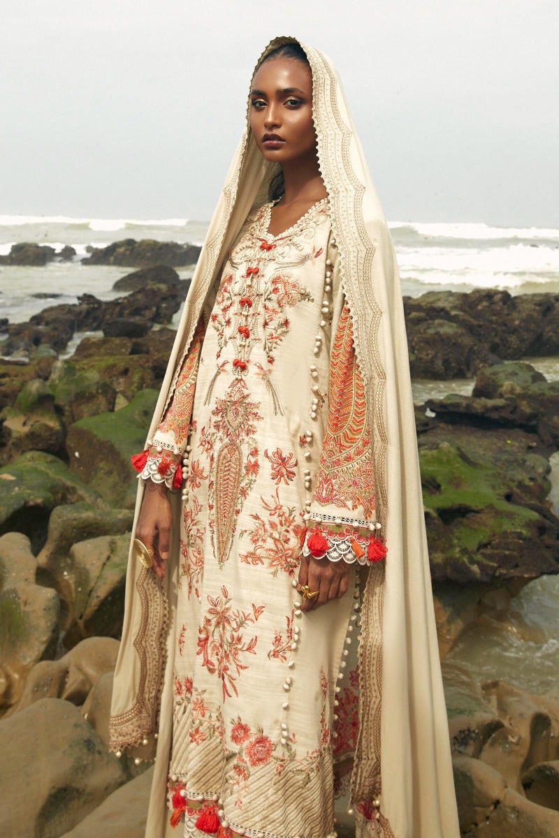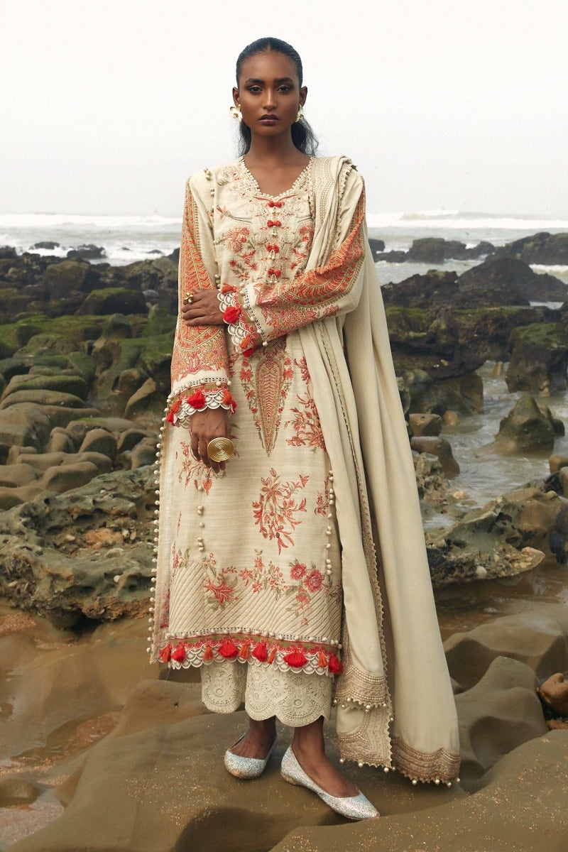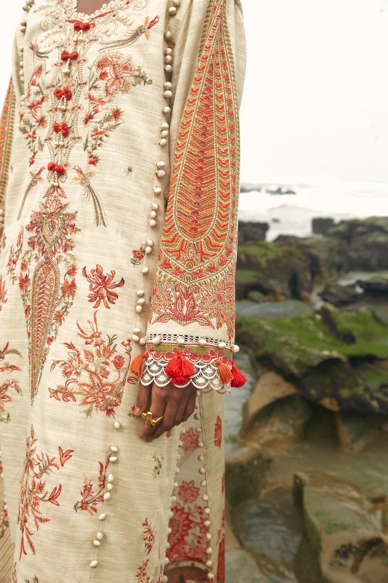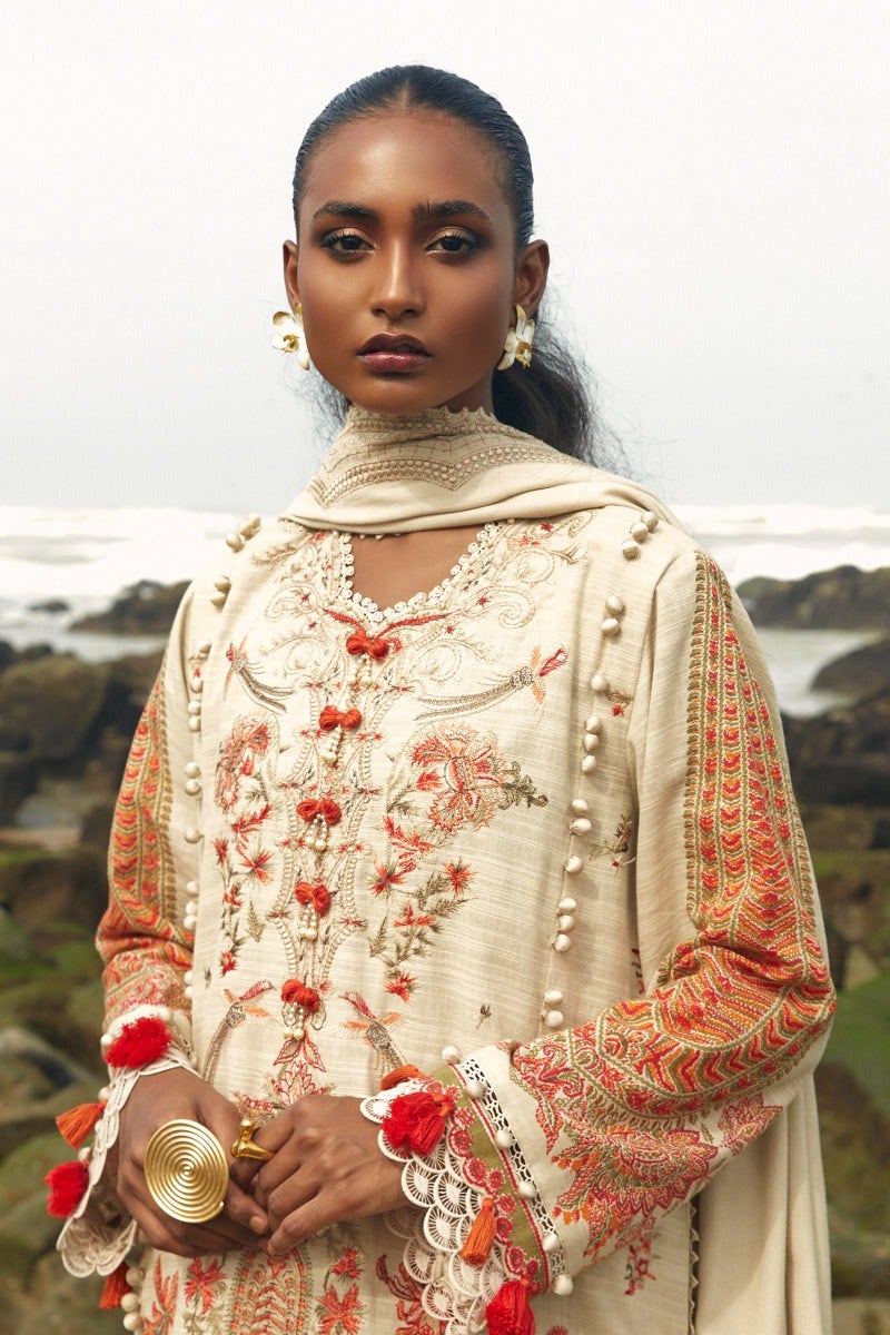 Fabric: A spectacular fusion of Indian paisley is woven together with the quintessential SS styling to create a beautiful look in tones of beige, tangerine, red, and olive. Complemented with beige pants and a lovely herringbone shawl.