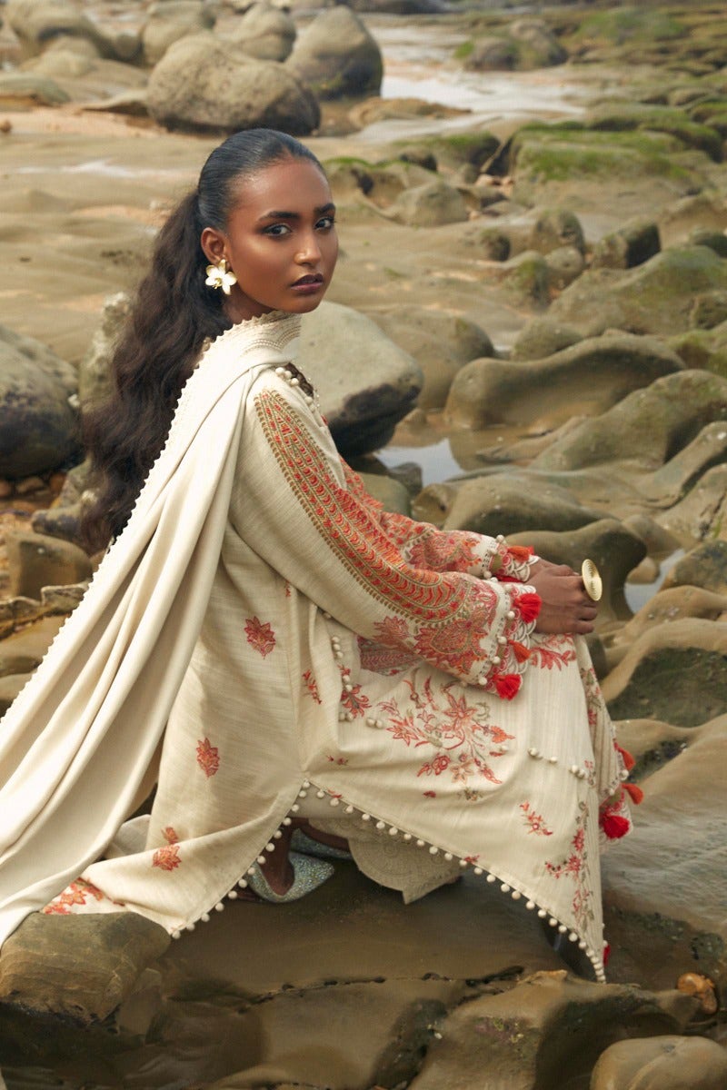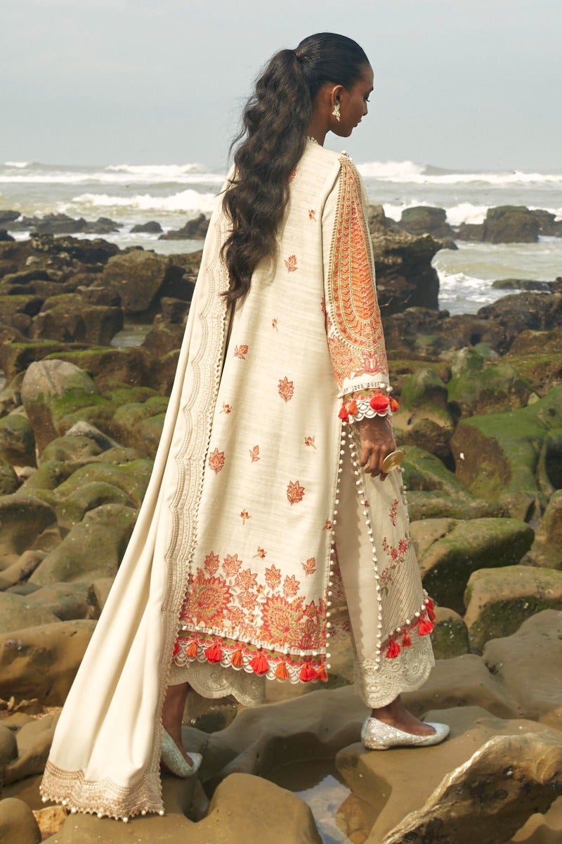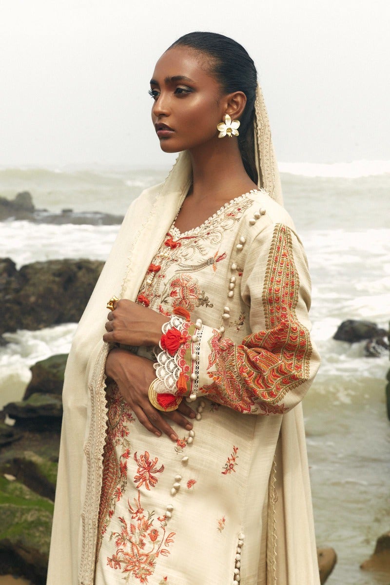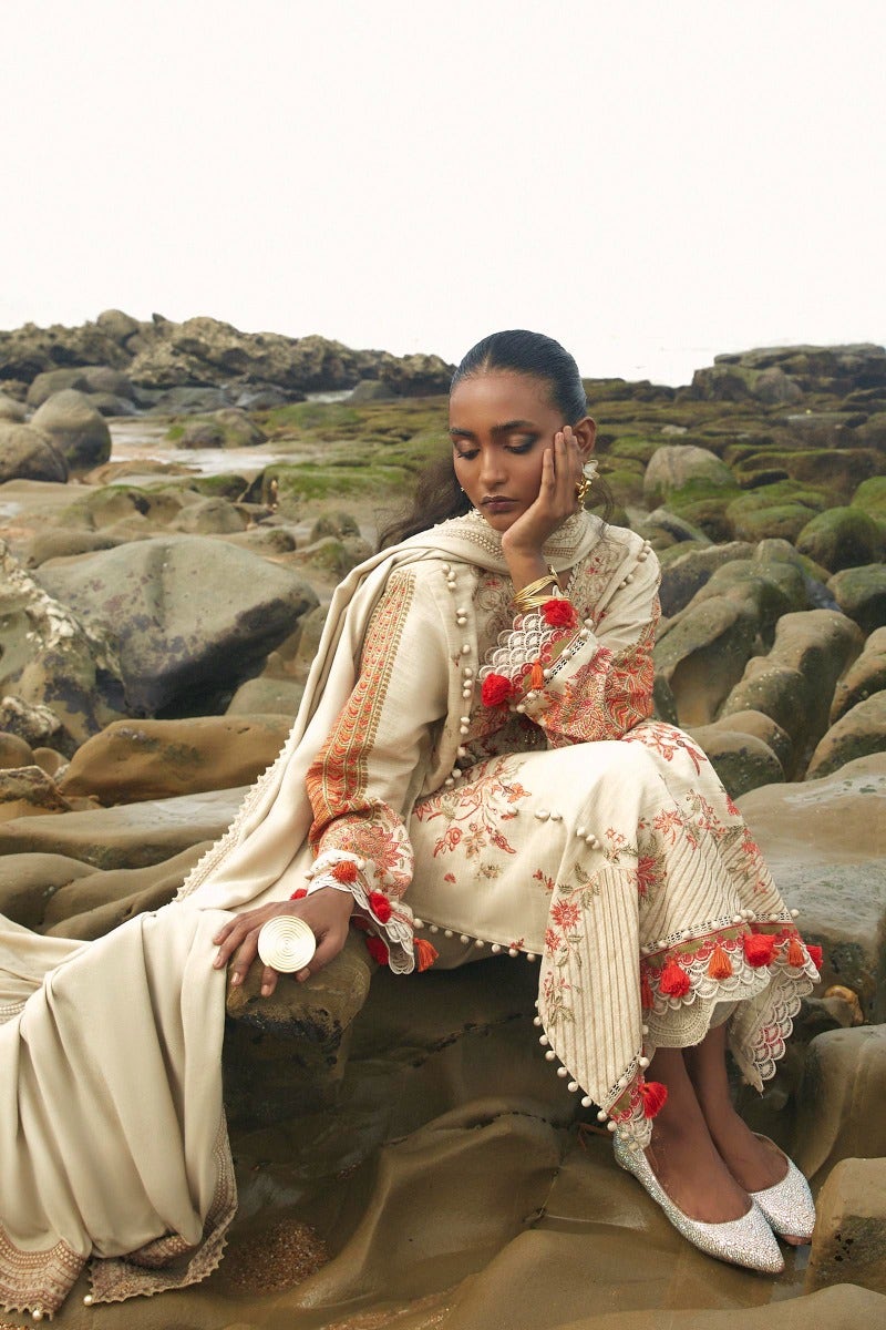 Fabric: A spectacular fusion of Indian paisley is woven together with the quintessential SS styling to create a beautiful look in tones of beige, tangerine, red, and olive. Complemented with beige pants and a lovely herringbone shawl.