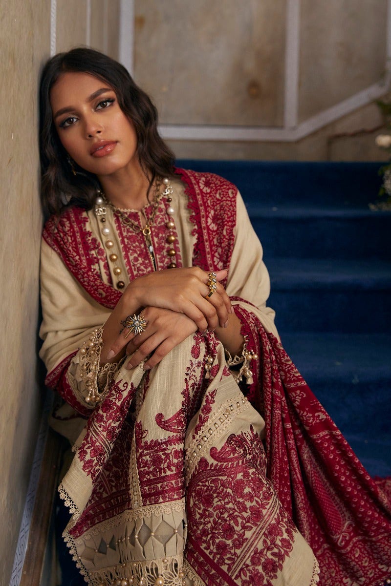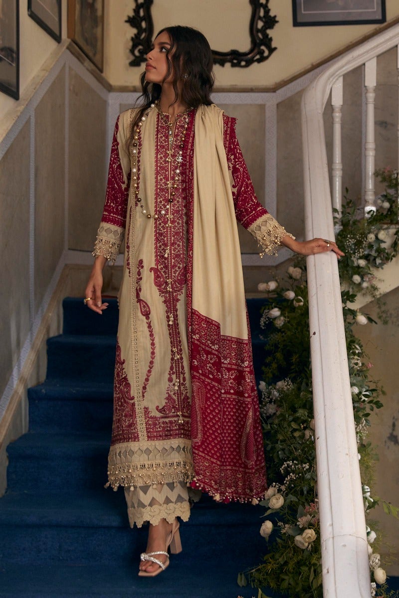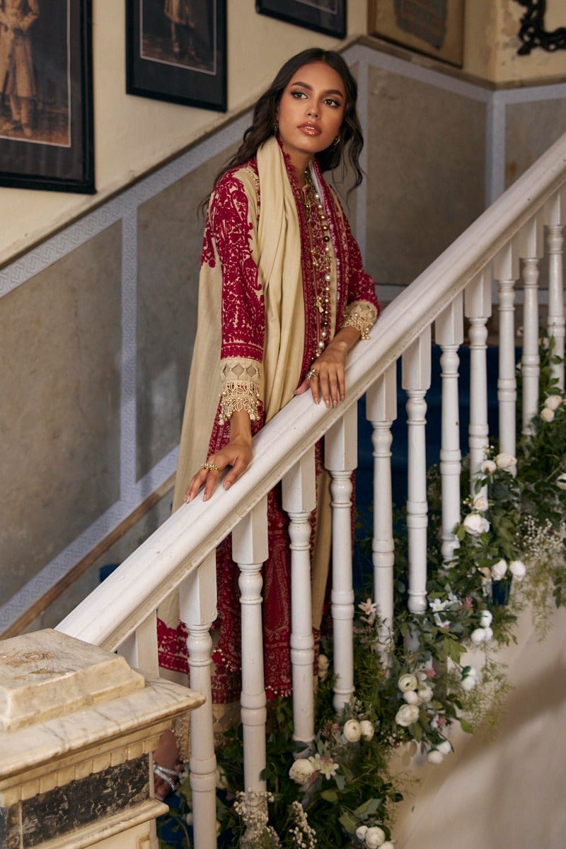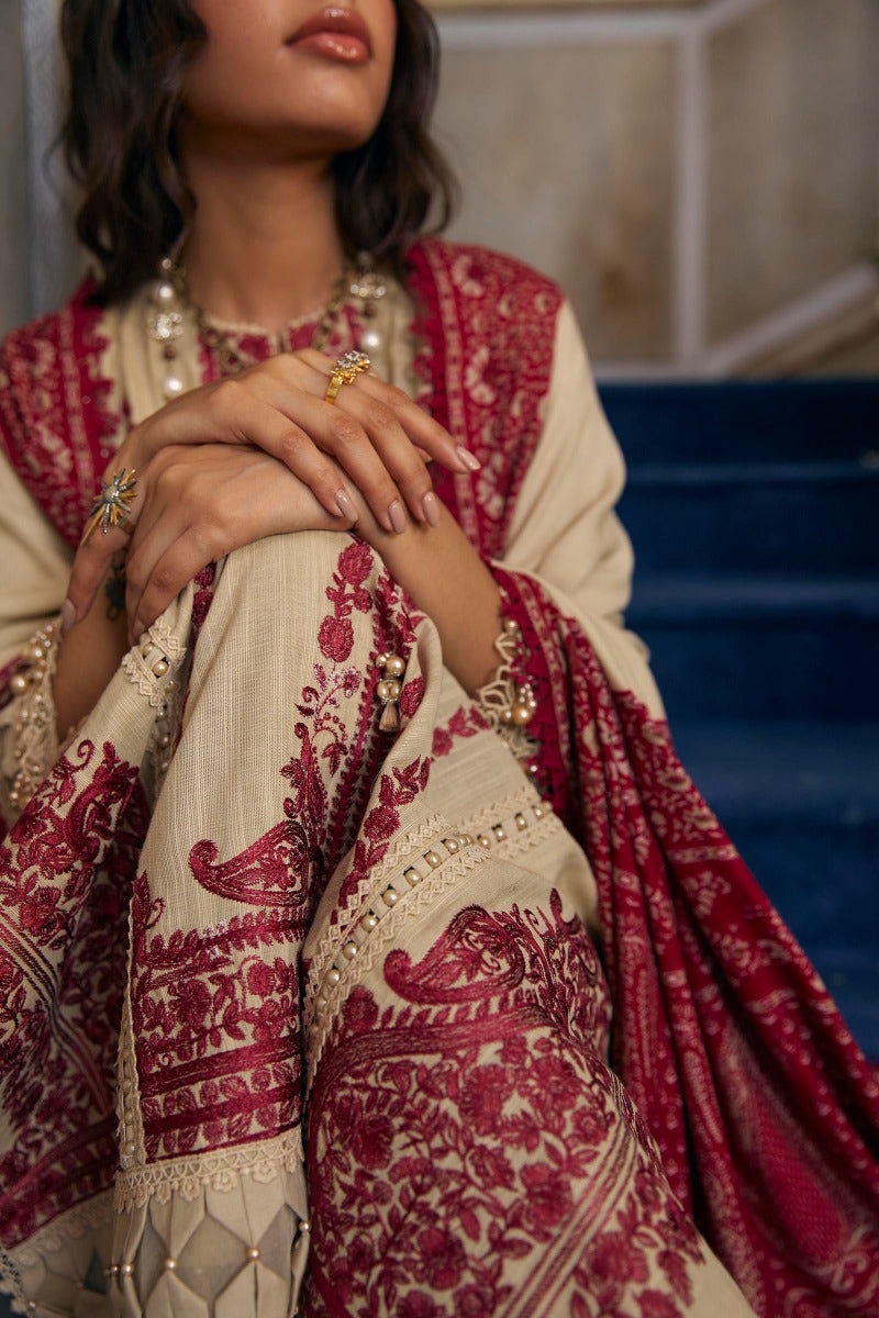 The exquisite artistry of Persian embroidery provides a bright display of beauty in beige and carmine, exuding an outfit with a royal attitude. Complemented with matching pants and an excellent pashmina shawl.
