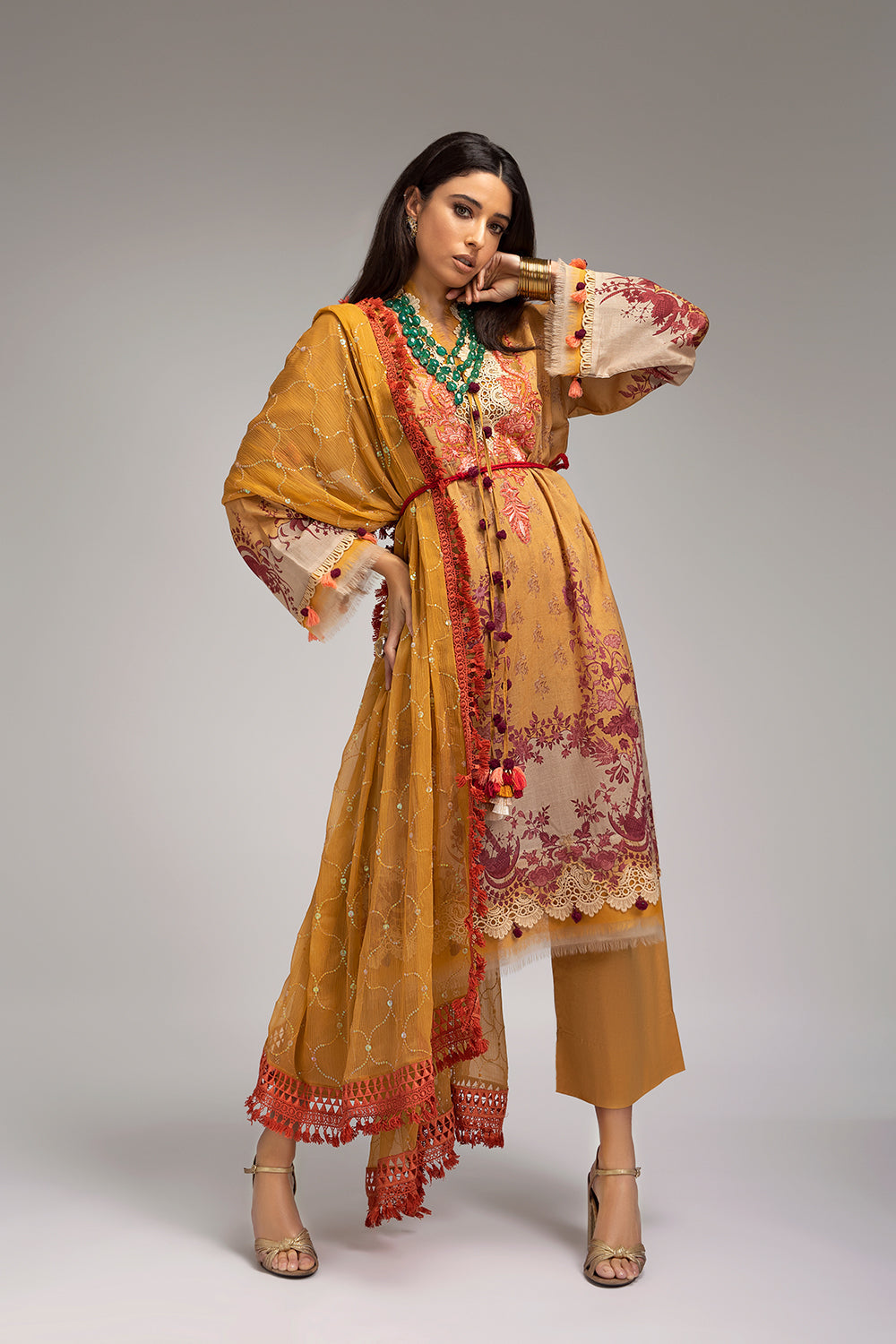 Fabric: Embroidered Neckline Patch Composed printed shirt Plain dyed trouser Embroidered chiffon duppata (extra laces, hangings and accessories are not included) Note: Product color may vary slightly due to photographic lighting or your device settings |