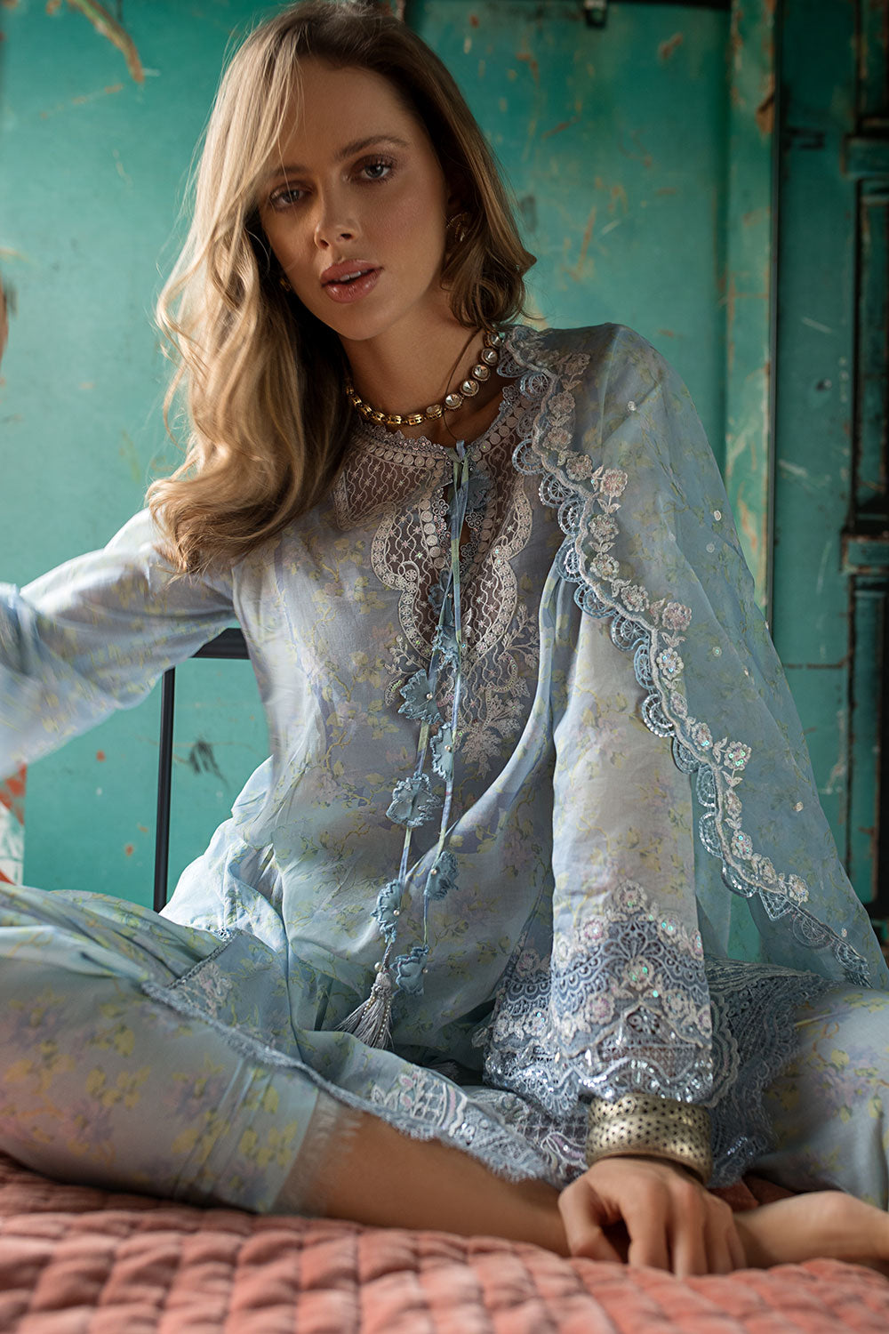 Fabric: Unstitched Suit includes: Printed Shirt Embroidered Neckline Patch Embroidered Daman Border Embroidered Sleeves Border Printed Trousers Printed Embroidered Organza Dupatta (extra laces, hangings and accessories are not included) |