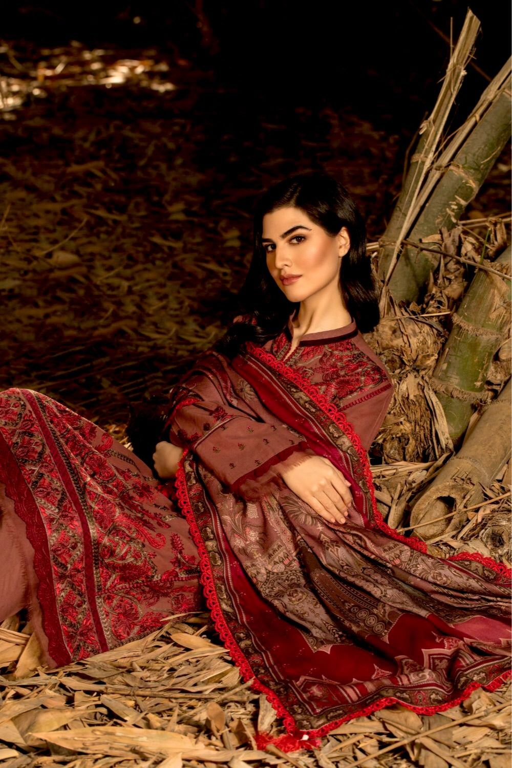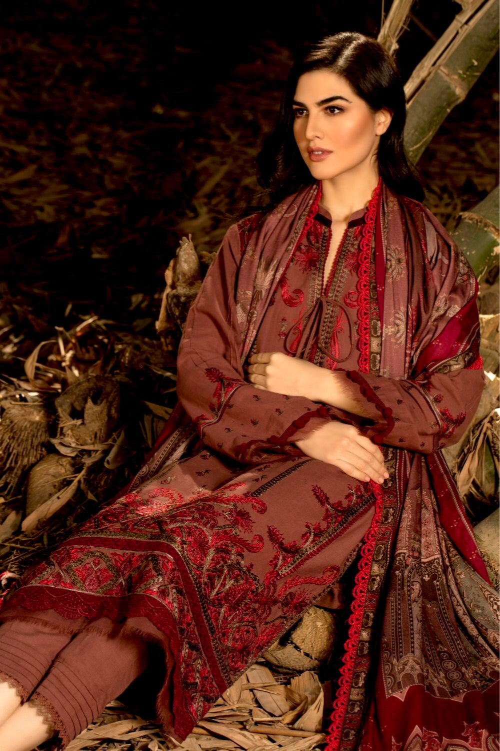 Fabric: Embroidered Front Center Panel ( Khaddar ) Embroidered Left Right-Side Panel ( Khaddar ) Embroidered Daman Border ( Khaddar ) Embroidered Sleeves Border ( Khaddar ) Embroidered Sleeve ( Khaddar ) Plain Dyed Back ( Khaddar ) Plain Dyed Trousers ( Khaddar ) Printed Shawl (Dobby Shawl) (Extra Laces And Hangings Are Not Included) |