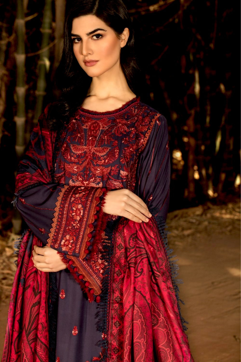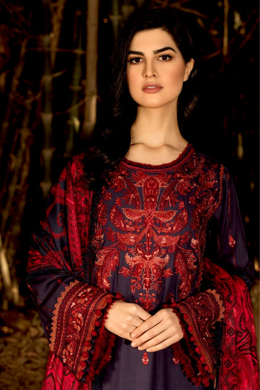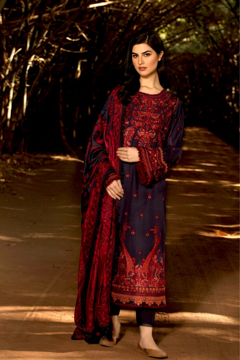Fabric: Embroidered Front Center Panel (Rib Cotel) Embroidered Left Right-Side Panels (Rib Cotel) Embroidered Daman Border (Rib Cotel) Embroidered Sleeves Border (Rib Cotel) Embroidered Sleeves (Rib Cotel) Plain Dyed Trouser (Rib Cotel) Plain Dyed Back (Rib Cotel) Printed Shawl (Dobby Shawl) (Extra Laces And Hangings Are Not Included) |
